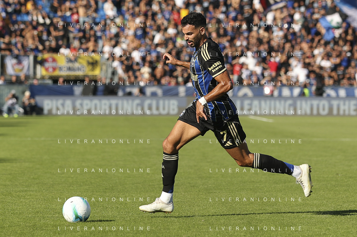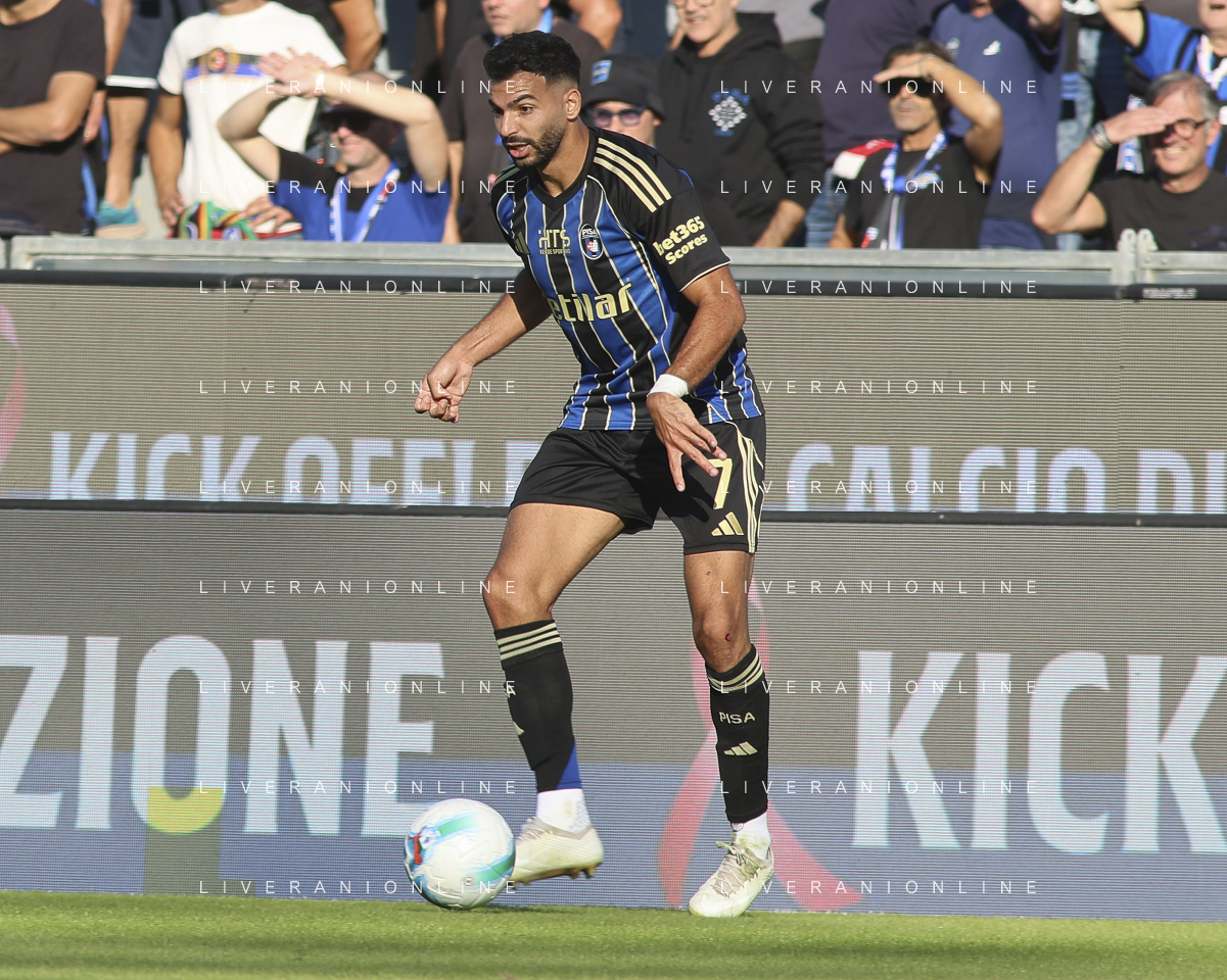 Mehdi Leris of Pisa SC play the ball during Pisa SC vs Hellas Verona FC, 7° Serie A Enilive 2025-26 game at Arena Garibaldi - Romeo Anconetani stadium in Pisa (PI), Italy, on October 18, 2025. (Photo by Davide Casentini) AG ALDO LIVERANI SAS