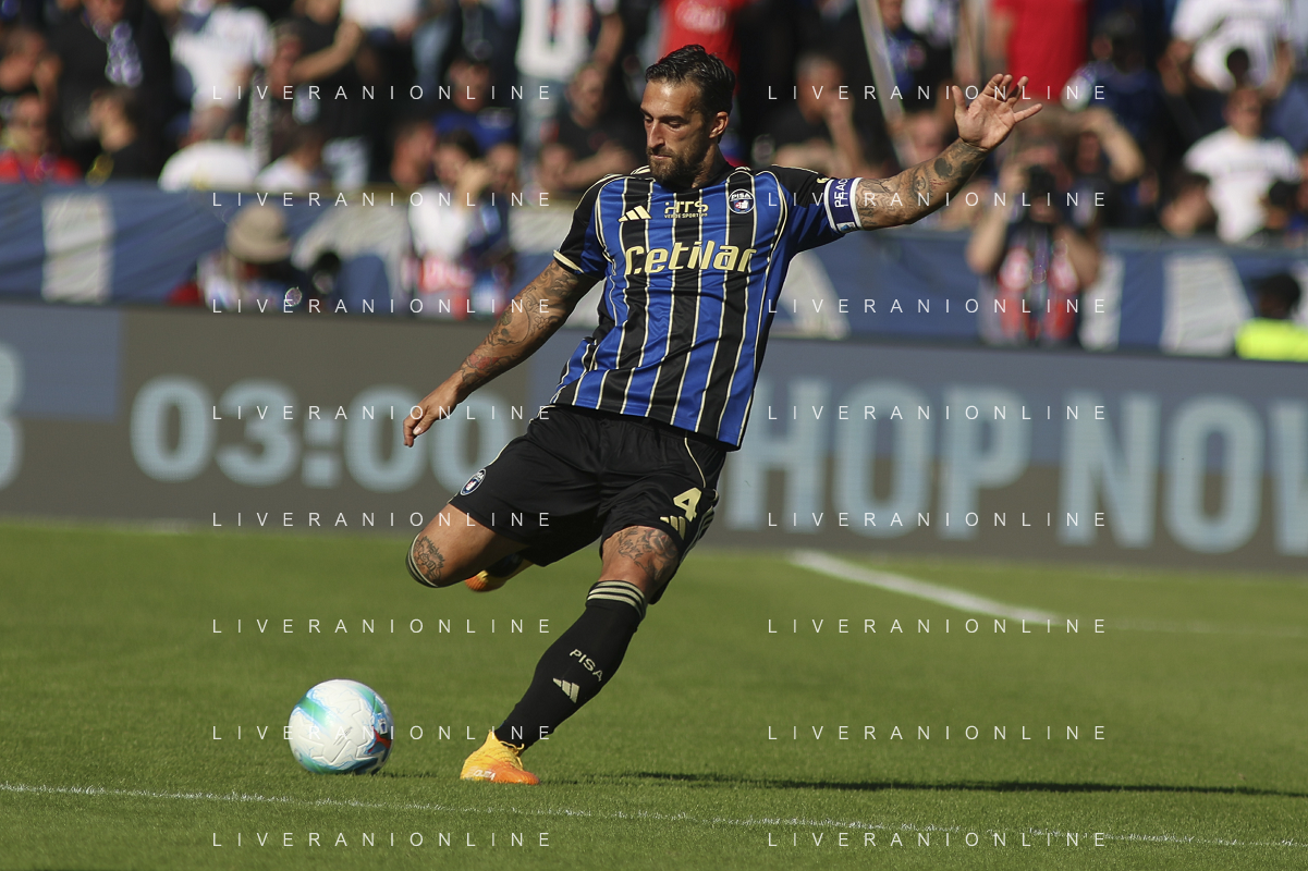 Adrian Semper of Pisa SC play the ball during Pisa SC vs Hellas Verona FC, 7° Serie A Enilive 2025-26 game at Arena Garibaldi - Romeo Anconetani stadium in Pisa (PI), Italy, on October 18, 2025. (Photo by Davide Casentini) AG ALDO LIVERANI SAS