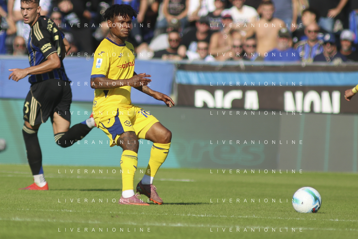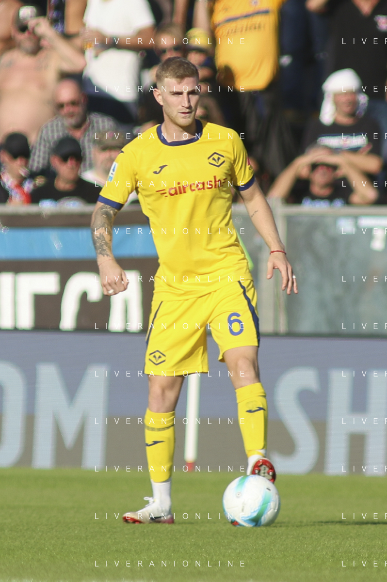 Daniel Mosquera of Hellas Verona FC play the ball during Pisa SC vs Hellas Verona FC, 7° Serie A Enilive 2025-26 game at Arena Garibaldi - Romeo Anconetani stadium in Pisa (PI), Italy, on October 18, 2025. (Photo by Davide Casentini) AG ALDO LIVERANI SAS