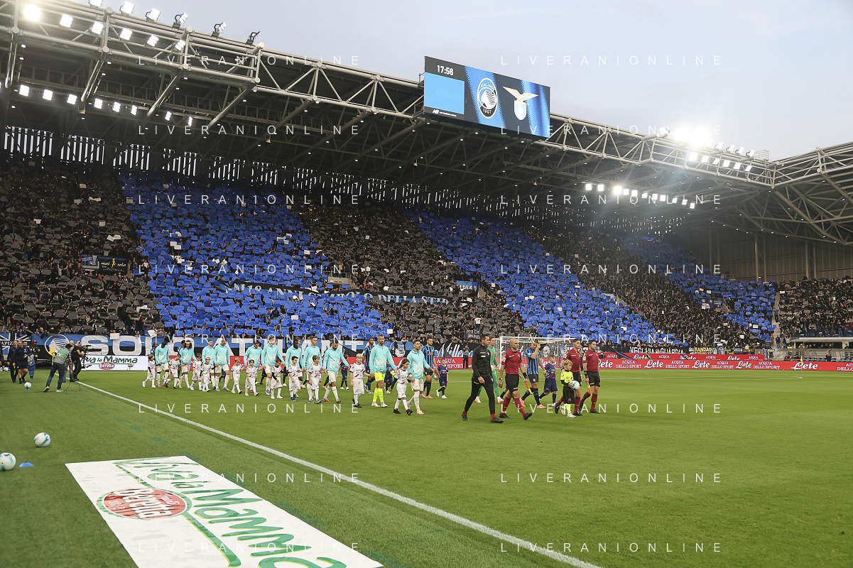 Atalanta BC team and Lazio team walk in the pich Atalanta BC vs SS Lazio, 7° Serie A Enilive 2025-26 game at New Balance arena in Bergamo (BG), Italy, on October 19, 2025. (Photo by Davide Casentini) ag aldo liverani sas