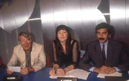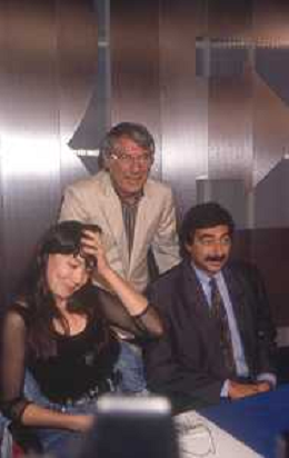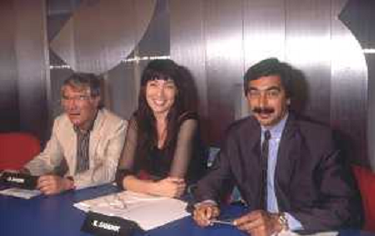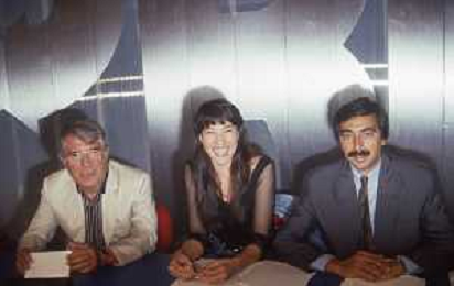 DIAP-RETROSPETTIVA KAY SANDWIK CONDUTTRICE TELEVISIVA E RADIOFONICA NELLA FOTO KAY SANDWIK CON OMAR SIVORI E MARINO BARTOLETTI CONDUCE LA TRASMISSIONE “PRESSING“ NELL'ANNO 1990 AG ALDO LIVERANI SAS