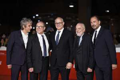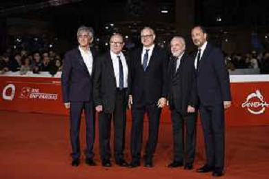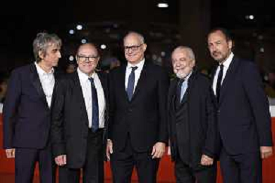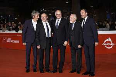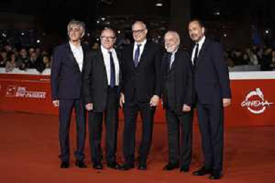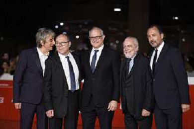 Roma 26 Ottobre 2025 Rome Film Festival - Red Carpet di chiusura con la quarta stagione di "Vita da Carlo" Nella Foto: Sergio Rubini, Carlo Verdone, Roberto Gualtieri, Aurelio De Laurentiis, Luigi De Laurentiis Foto Credit: Andrea Bracaglia AG ALDO LIVERANI SAS