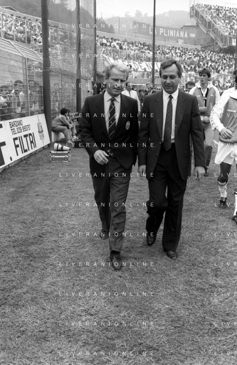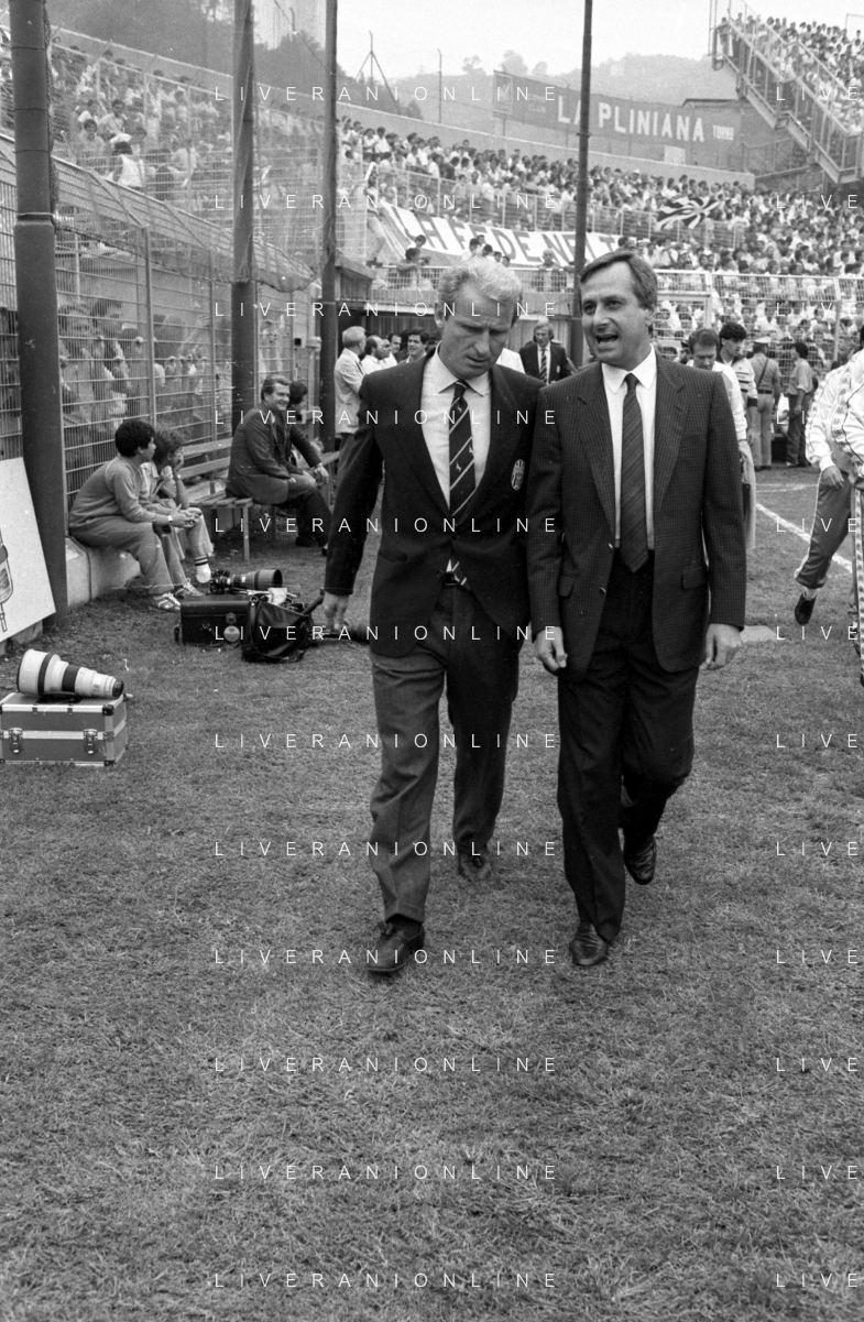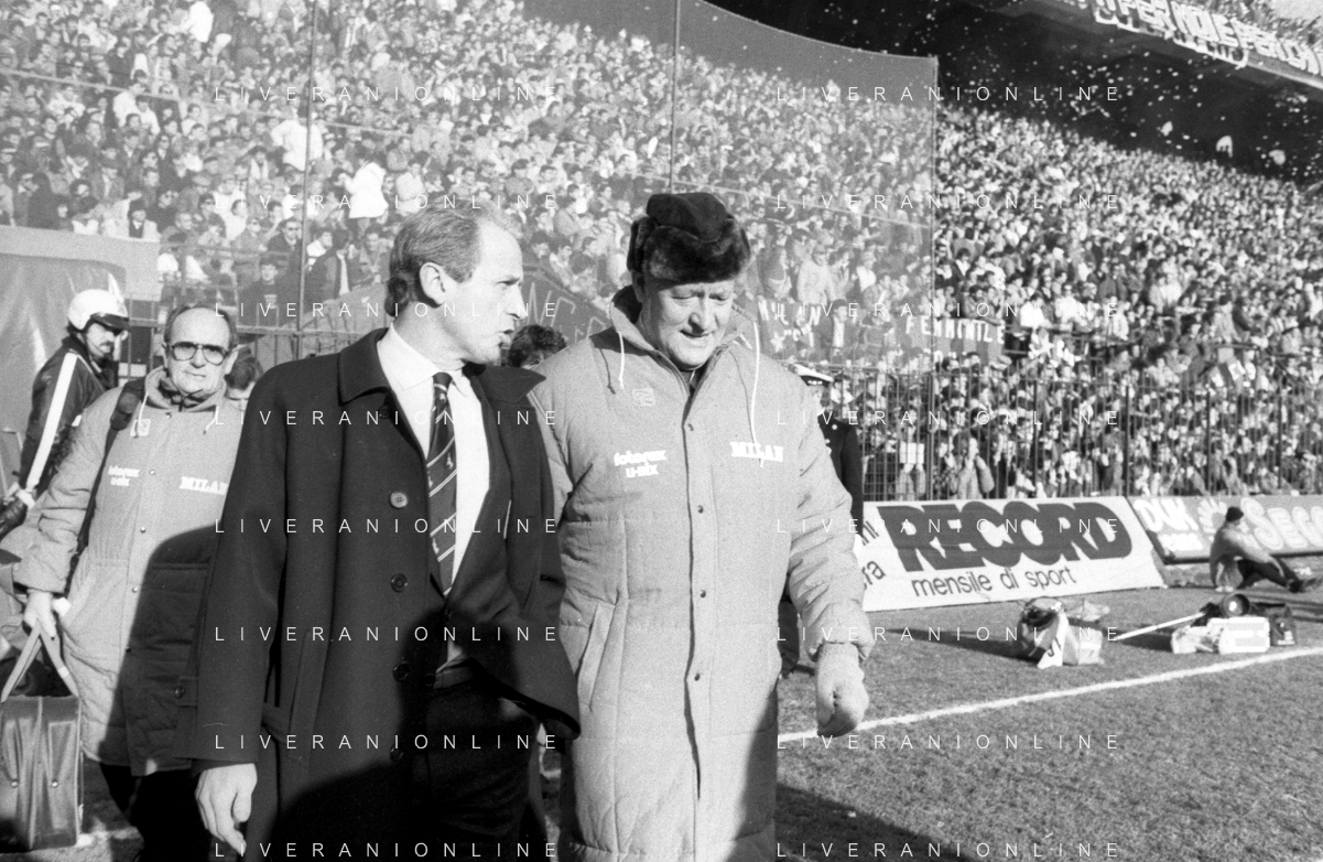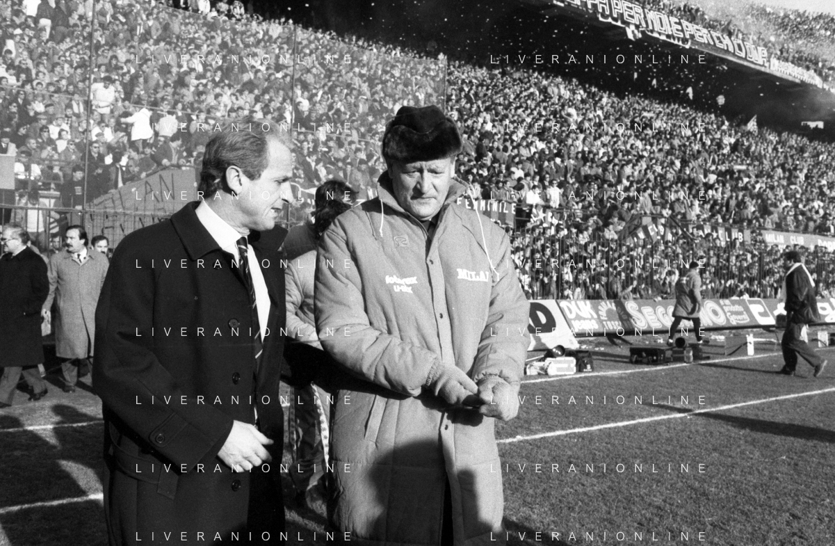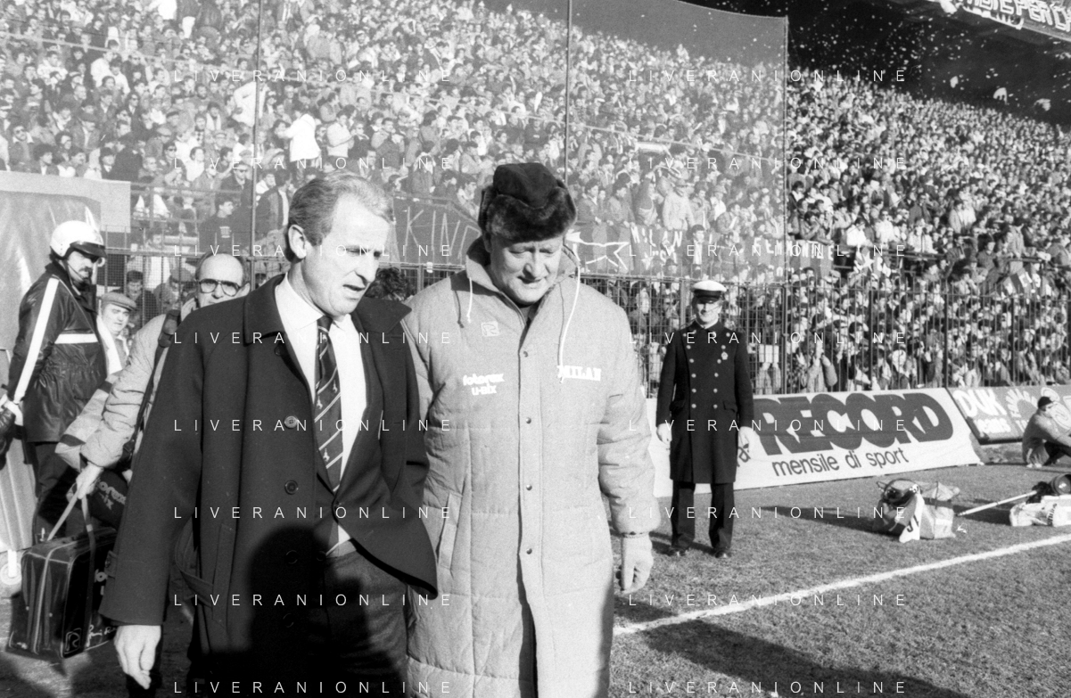 NEG- RETROSPETTIVA GIOVANNI TRAPATTONI ALLENATORE JUVENTUS NELLA FOTO GIOVANNI TRAPATTONI CON NILS LIEDHOLM (ALLENATORE MILAN ) NELL’ANNO 1985-1986 AG ALDO LIVERANI SAS