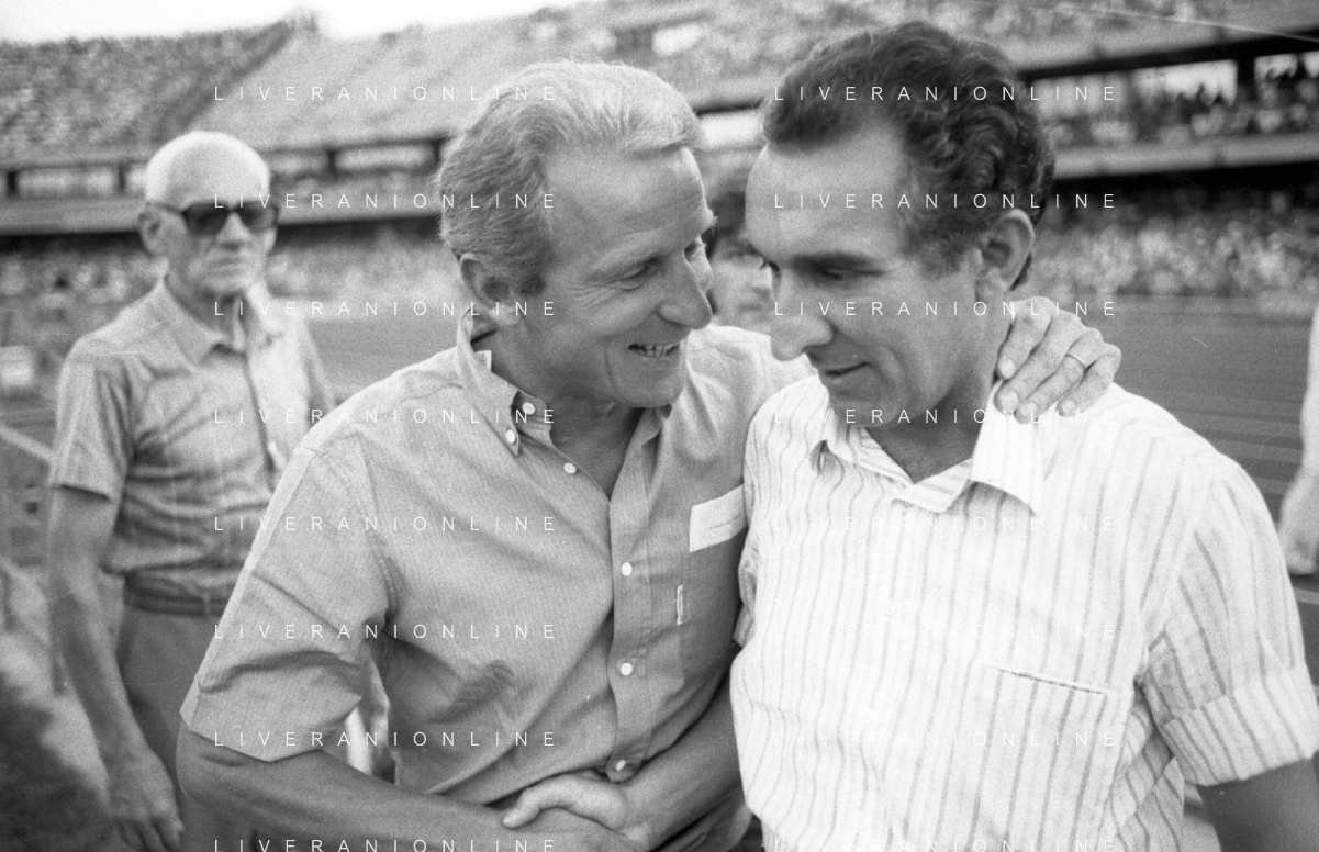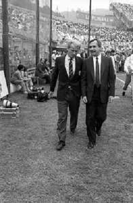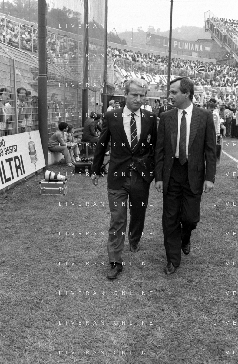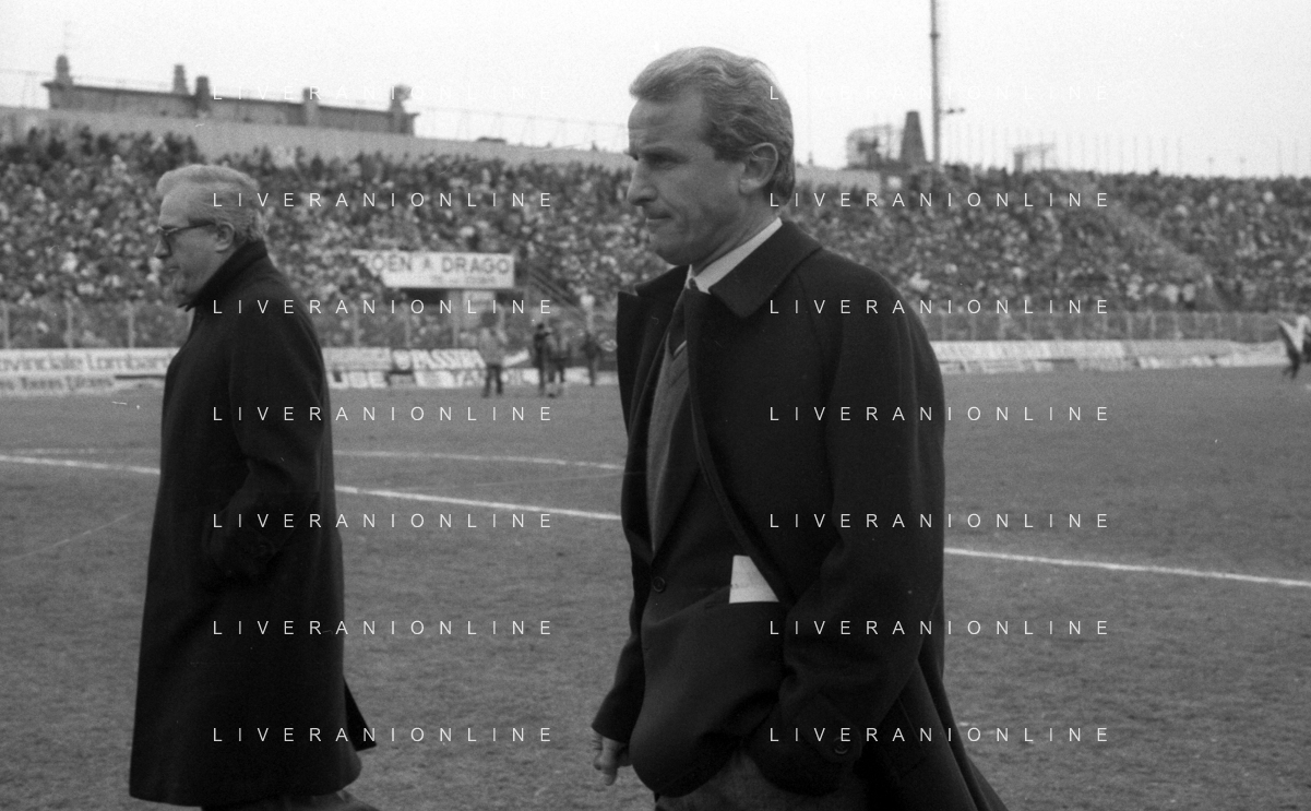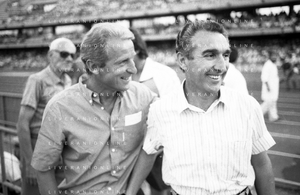 NEG- RETROSPETTIVA GIOVANNI TRAPATTONI ALLENATORE JUVENTUS NELLA FOTO GIOVANNI TRAPATTONI CON NILS LIEDHOLM (ALLENATORE MILAN ) NELL’ANNO 1985-1986 AG ALDO LIVERANI SAS