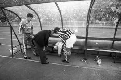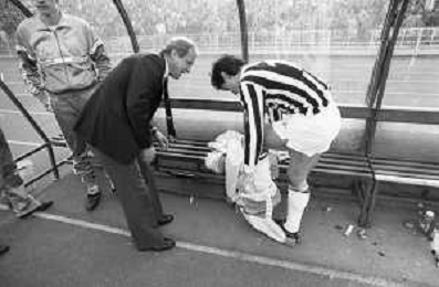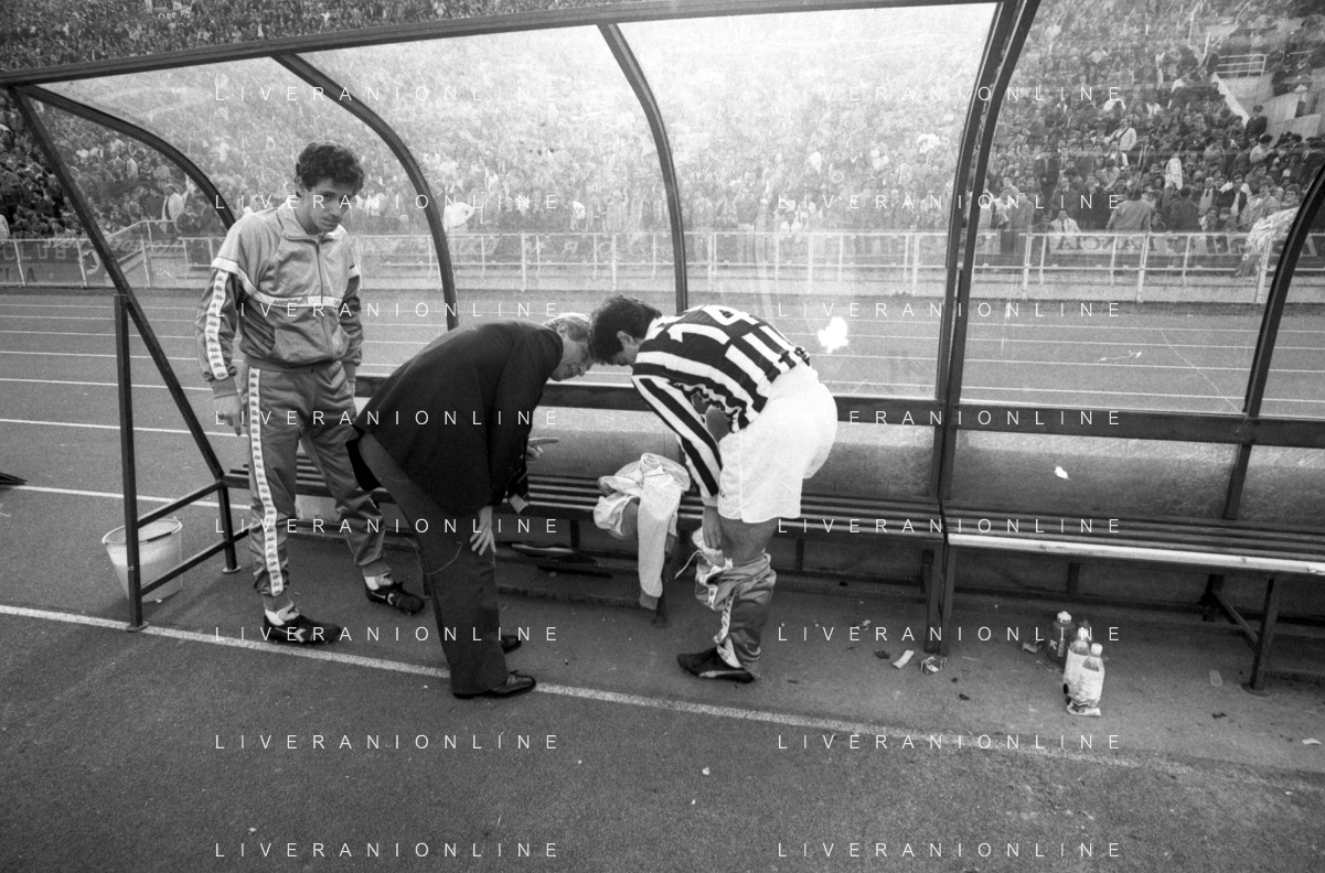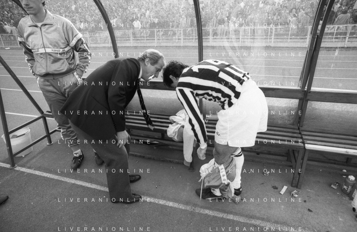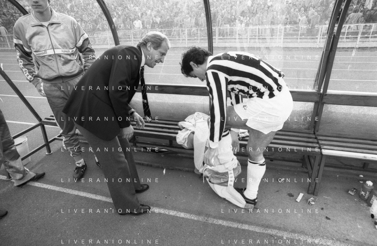 NEG- RETROSPETTIVA GIOVANNI TRAPATTONI ALLENATORE JUVENTUS NELLA FOTO GIOVANNI TRAPATTONI CON IL CALCIATORE MASSIMO BRIASCHI E RENATO BUSO IN PANCHINA NELL’ANNO 1985-1986 AG ALDO LIVERANI SAS