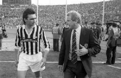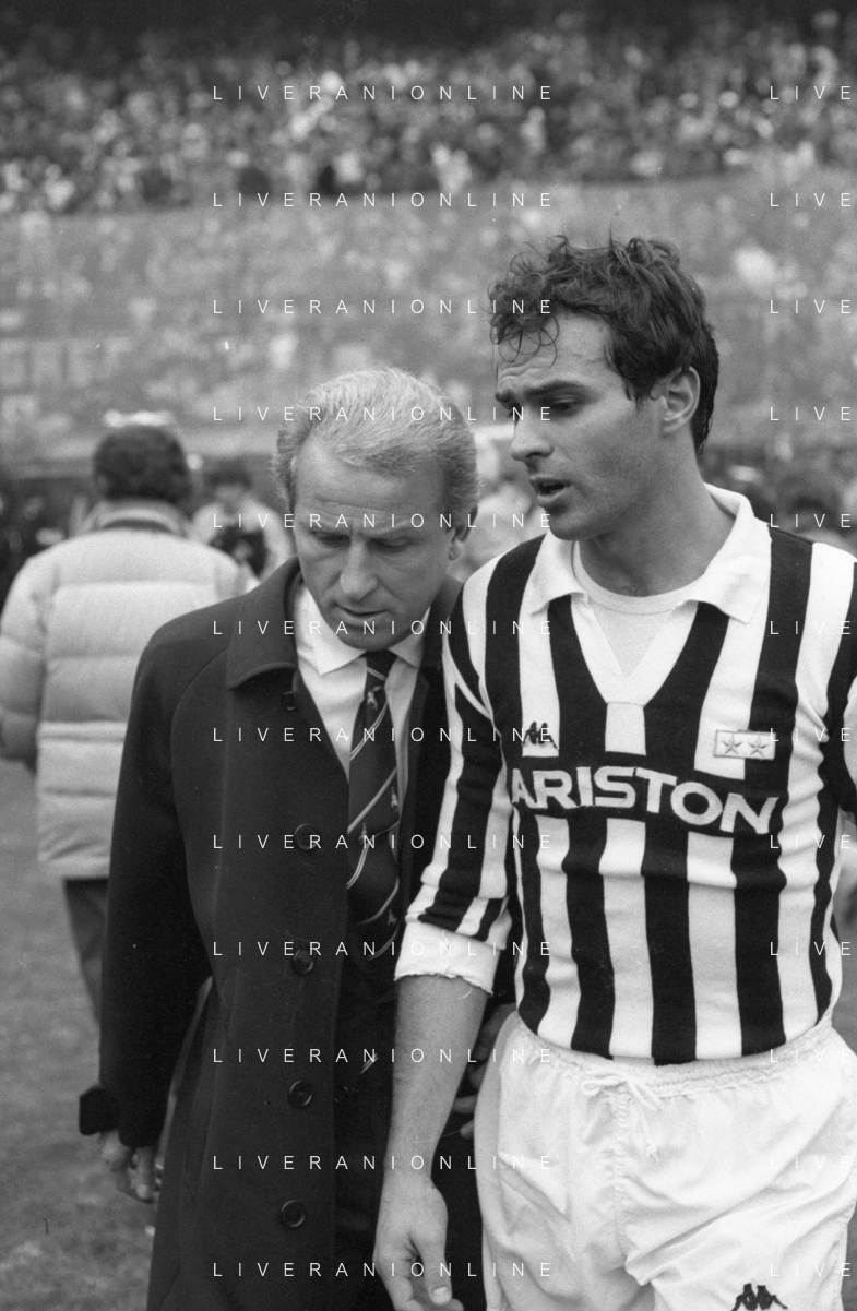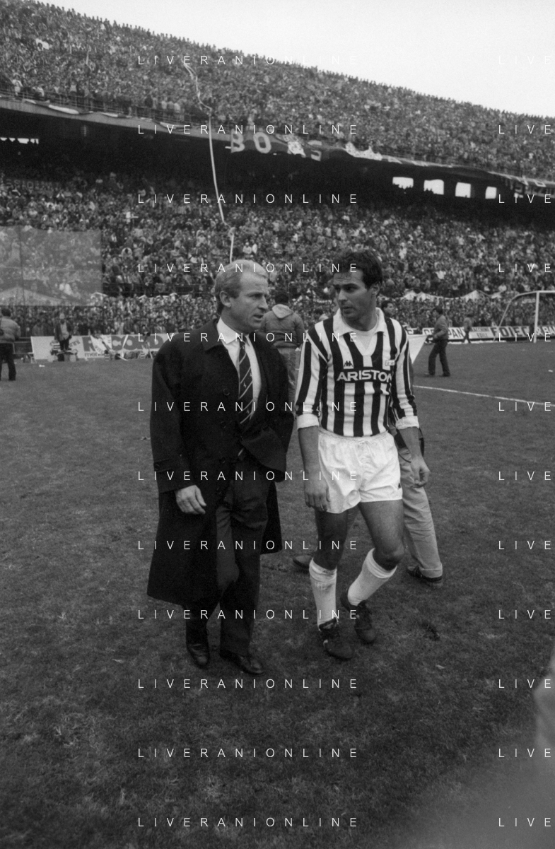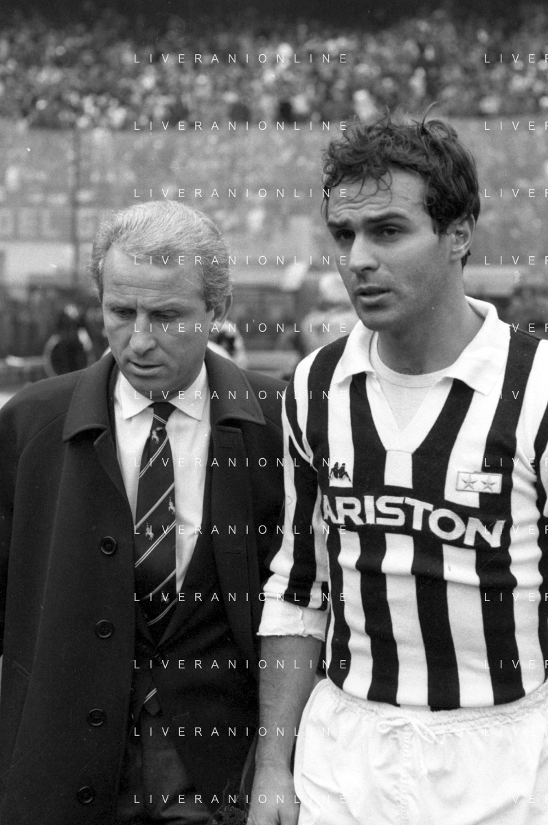 NEG- RETROSPETTIVA GIOVANNI TRAPATTONI ALLENATORE JUVENTUS NELLA FOTO GIOVANNI TRAPATTONI CON IL CALCIATORE ANTONIO CABRINI NELL’ANNO 1985-1986 AG ALDO LIVERANI SAS