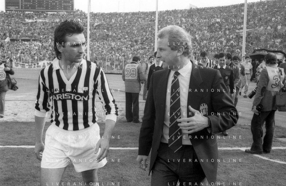 NEG- RETROSPETTIVA GIOVANNI TRAPATTONI ALLENATORE JUVENTUS NELLA FOTO GIOVANNI TRAPATTONI CON IL CALCIATORE LUCIANO BODINI NELL’ANNO 1985-1986 AG ALDO LIVERANI SAS