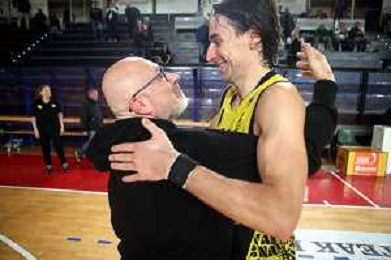 IMOLA 29 10 2025 VIRTUS IMOLA BASKET-CONSULTINVEST LORETO PESARO SERIE B1 93-85 NELLA FOTO ALLENATORE VIRTUS IMOLA GIANLUIGI GALETTI E MATTIA MELCHIORRI DOPO PARTITA FOTO GIANNI SANNA-AG ALDO LIVERANI SAS