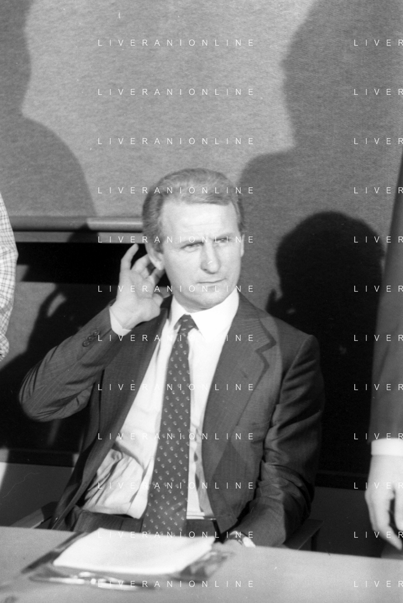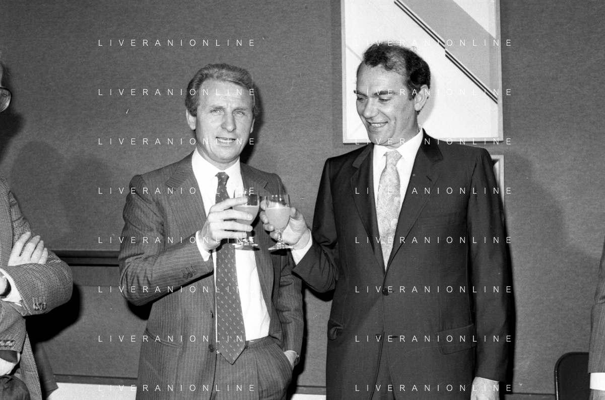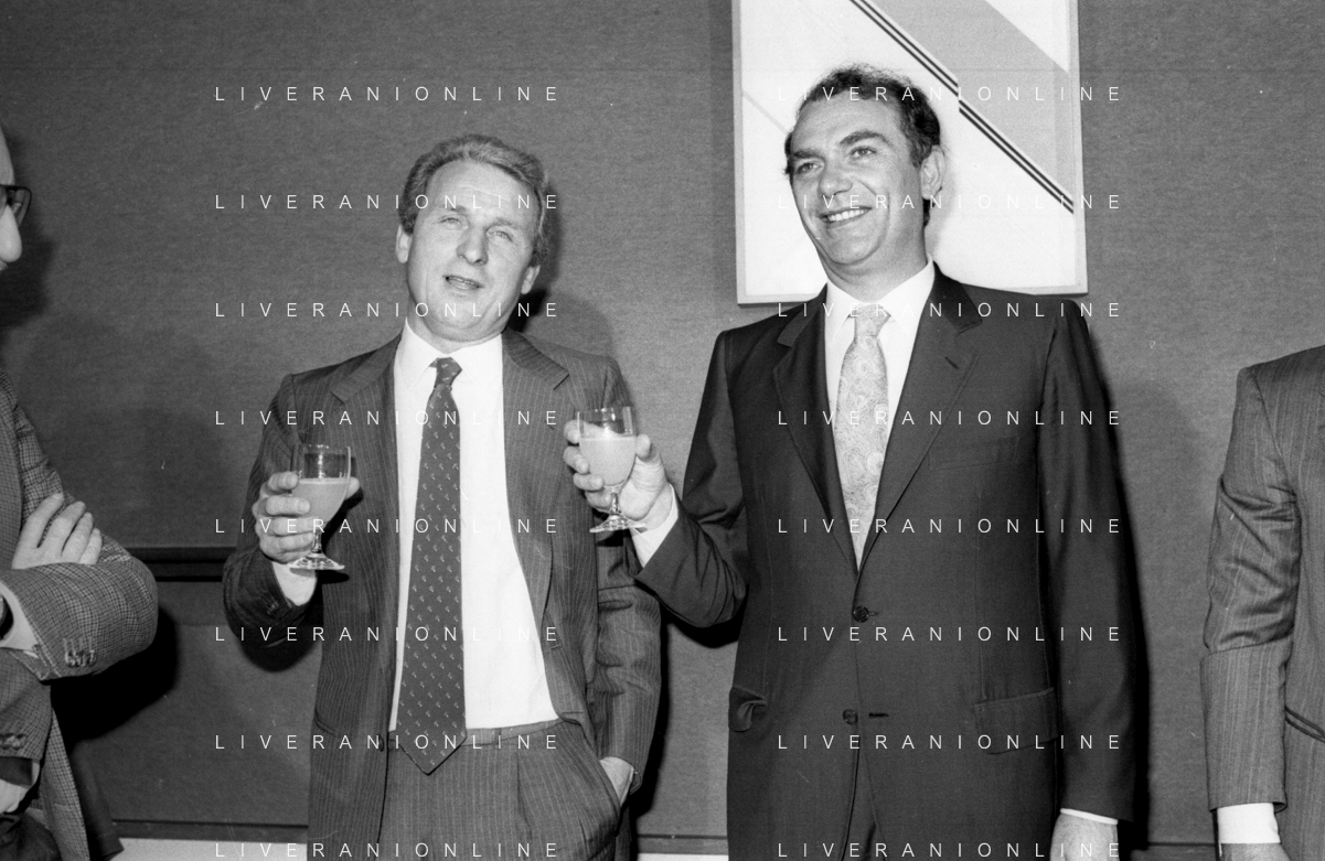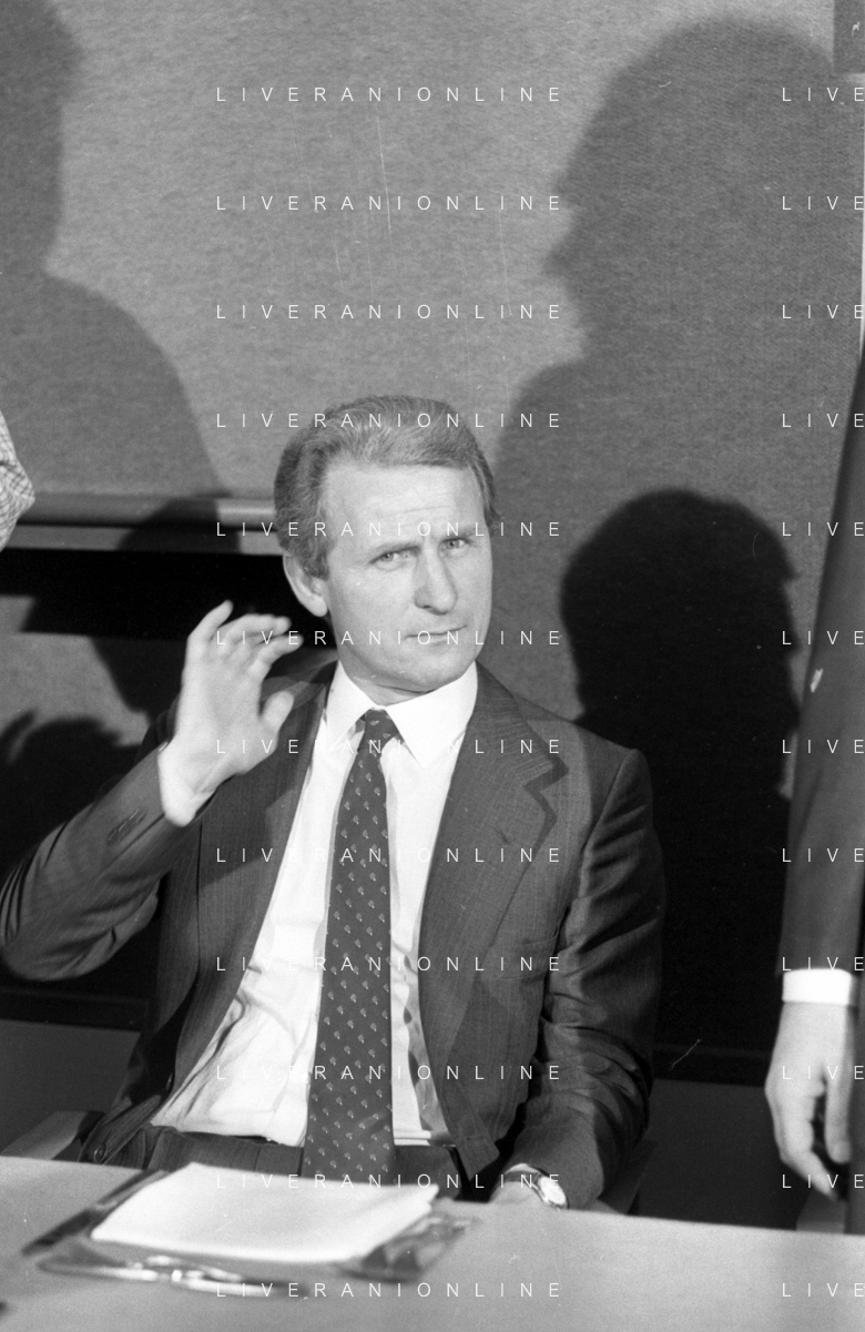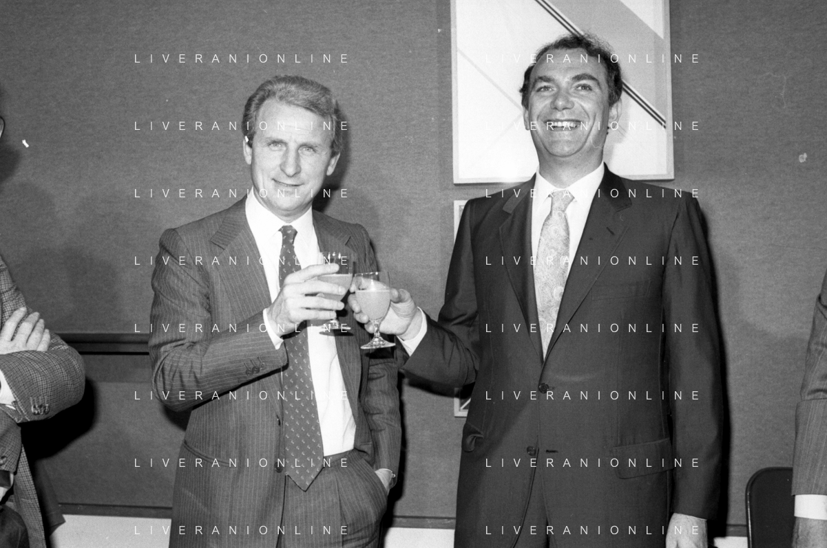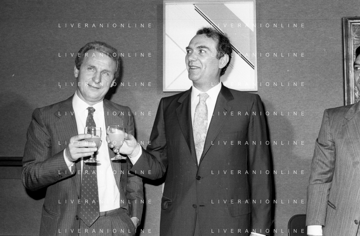 NEG- RETROSPETTIVA GIOVANNI TRAPATTONI ALLENATORE INTER NELLA FOTO GIOVANNI TRAPATTONI CON IL PRESIDENTE ERNESTO PELLEGRINI ALLA SUA PRESENTAZIONE COME NUOVO ALLENATORE INTER CALCIO NELL’ANNO 1986 AG ALDO LIVERANI SAS