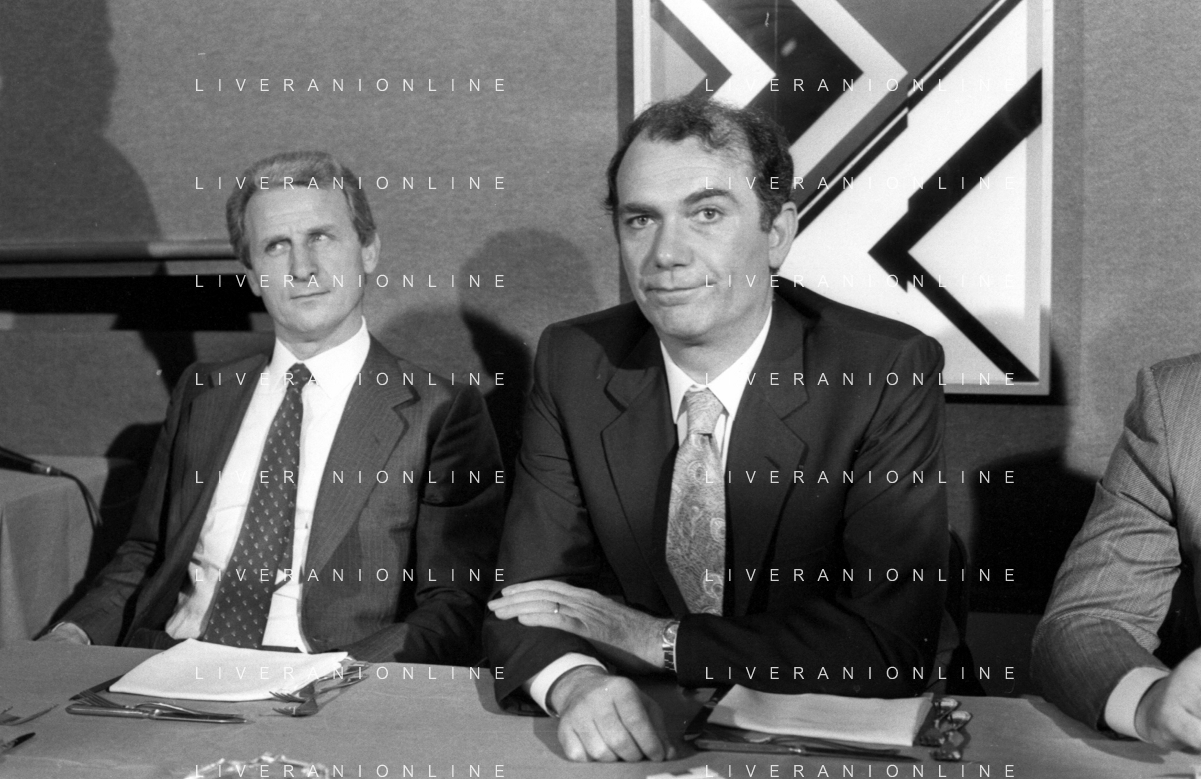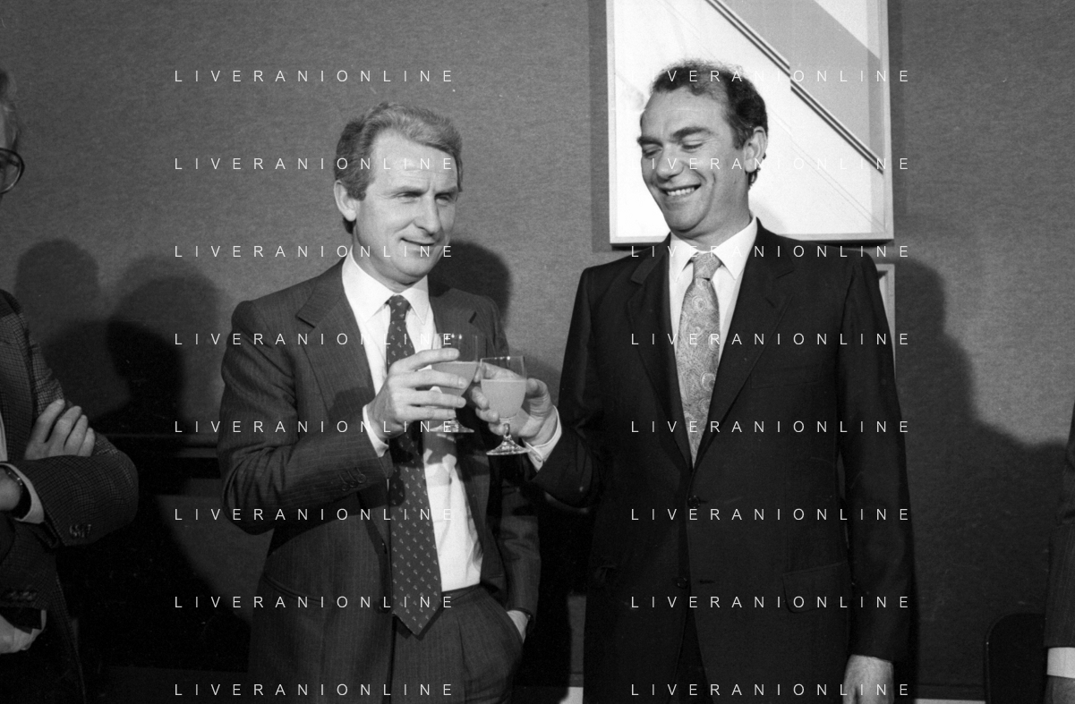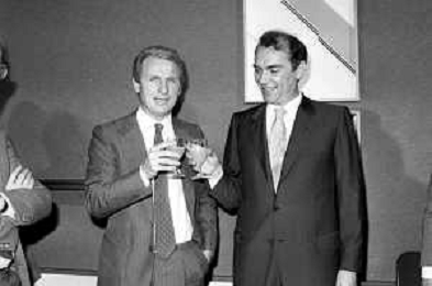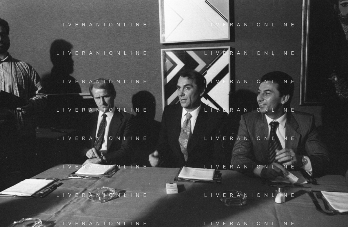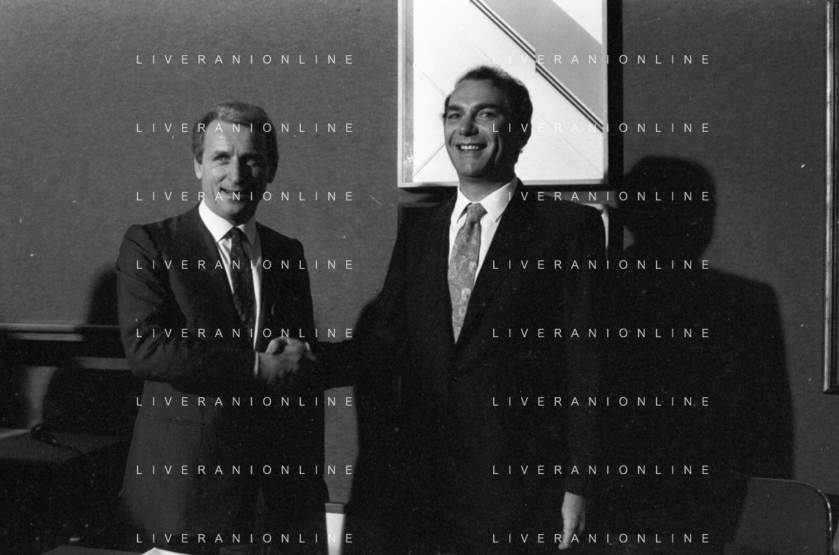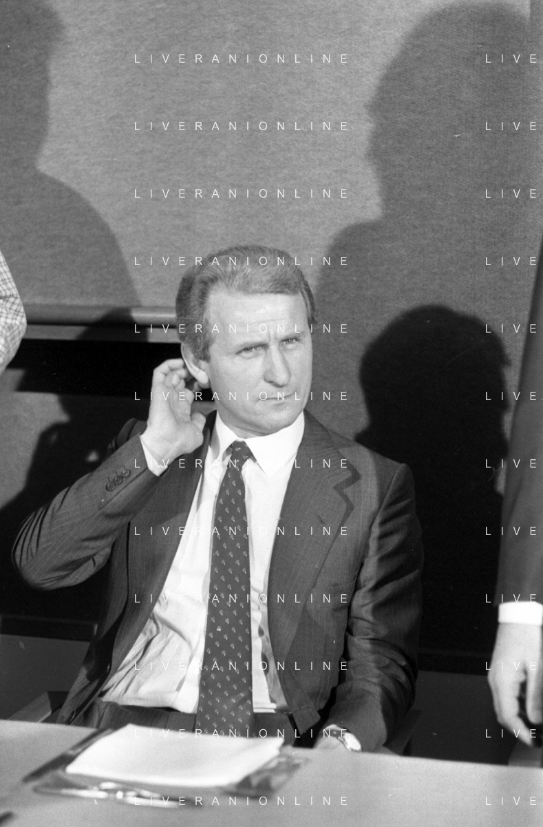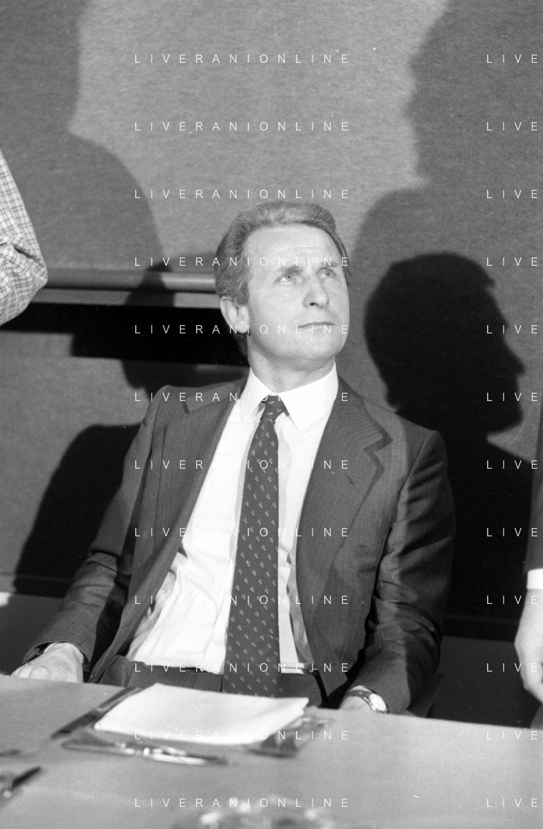 NEG- RETROSPETTIVA GIOVANNI TRAPATTONI ALLENATORE INTER NELLA FOTO GIOVANNI TRAPATTONI CON IL PRESIDENTE ERNESTO PELLEGRINI ALLA SUA PRESENTAZIONE COME NUOVO ALLENATORE INTER CALCIO NELL’ANNO 1986 AG ALDO LIVERANI SAS