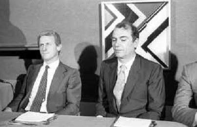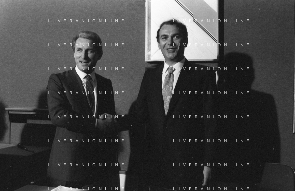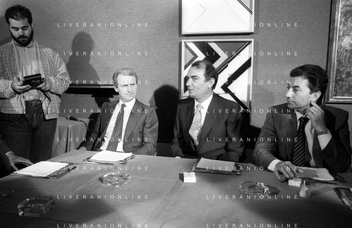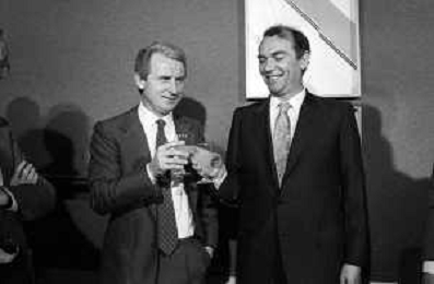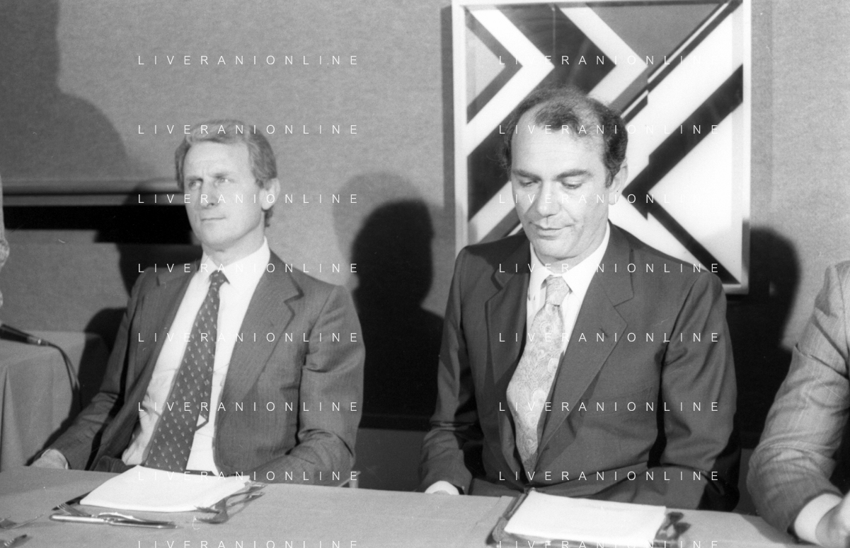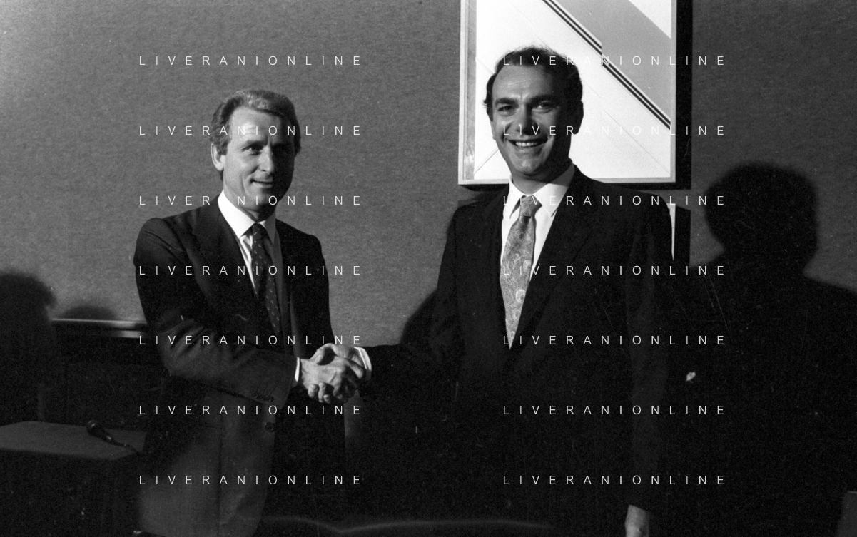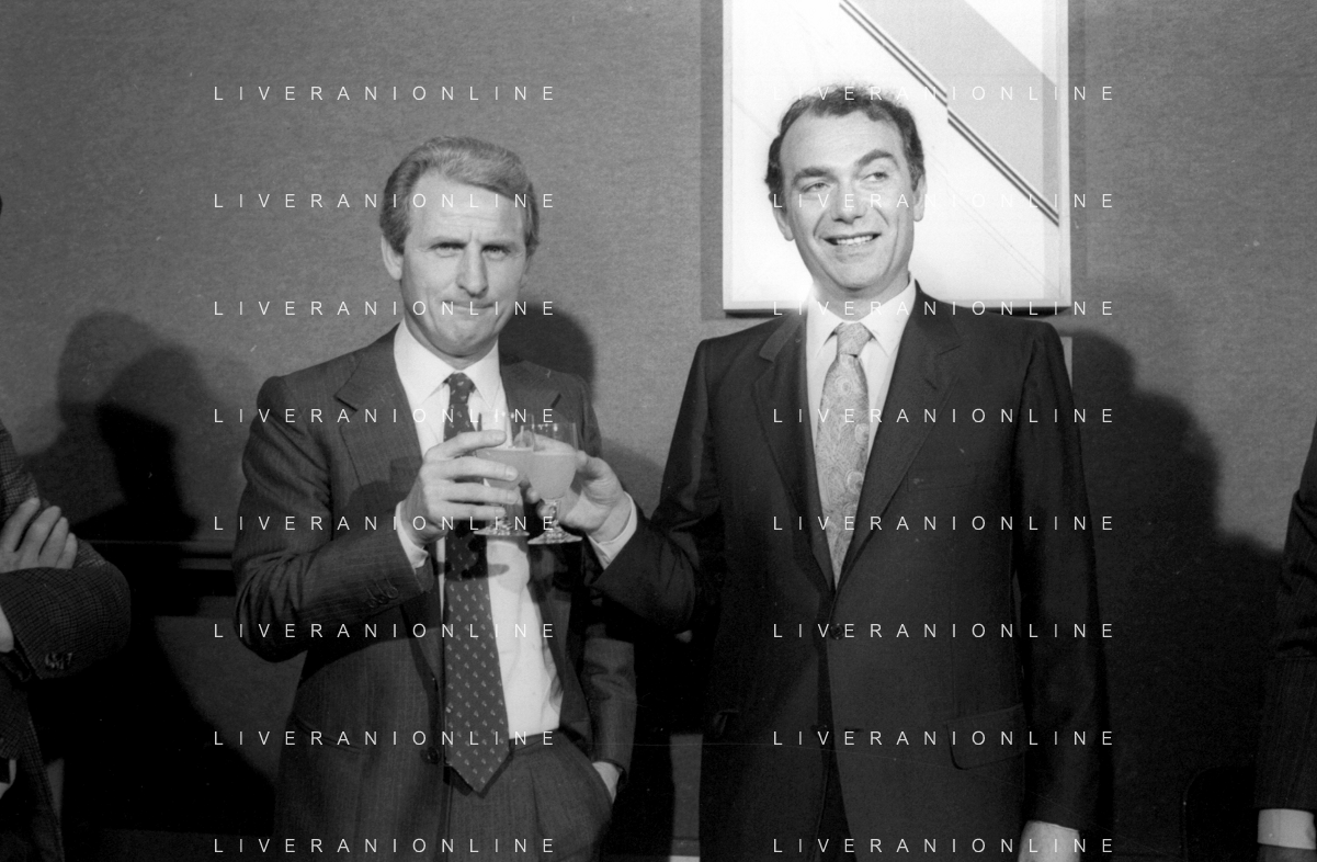 NEG- RETROSPETTIVA GIOVANNI TRAPATTONI ALLENATORE INTER NELLA FOTO GIOVANNI TRAPATTONI CON IL PRESIDENTE ERNESTO PELLEGRINI ALLA SUA PRESENTAZIONE COME NUOVO ALLENATORE INTER CALCIO NELL’ANNO 1986 AG ALDO LIVERANI SAS