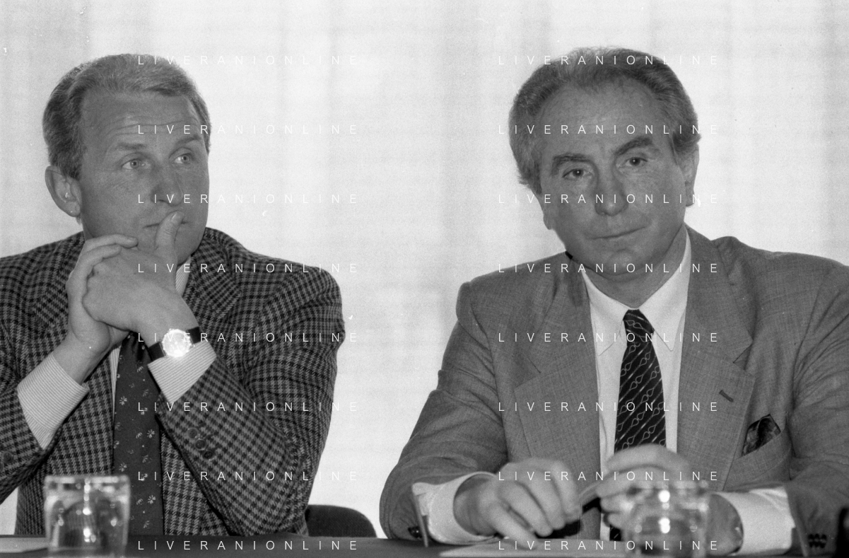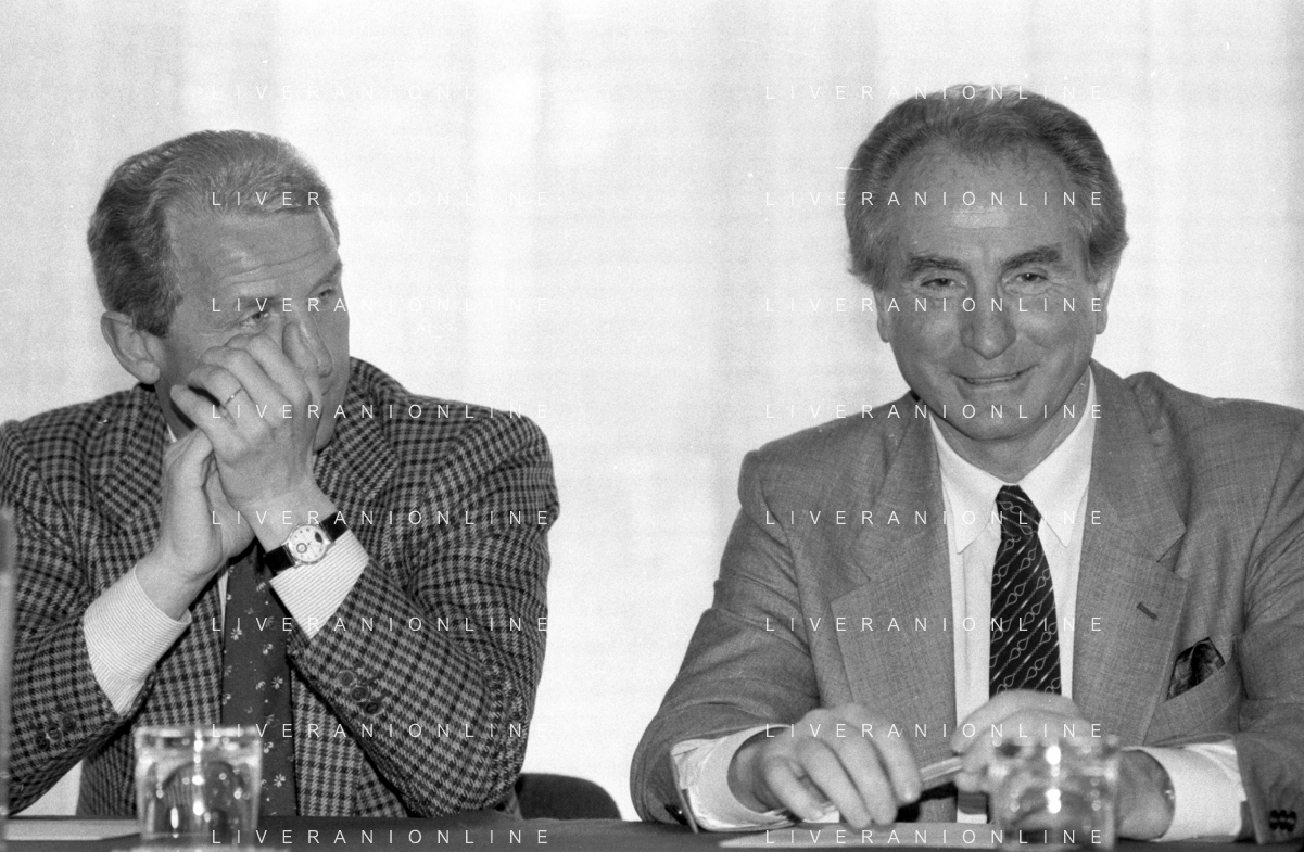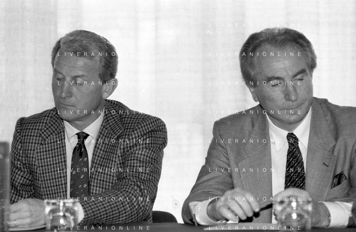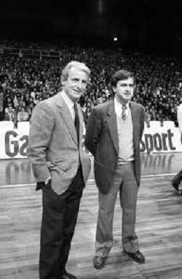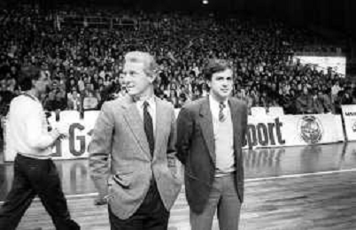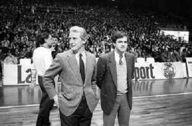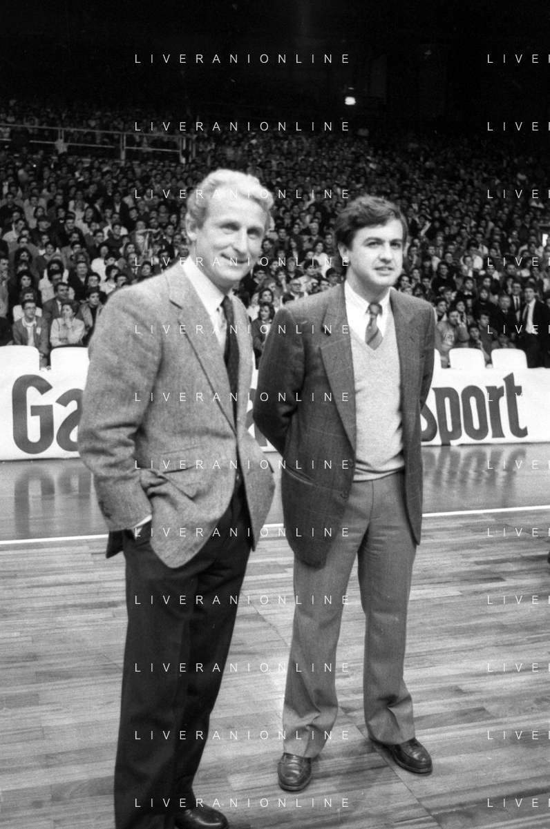 NEG- RETROSPETTIVA GIOVANNI TRAPATTONI ALLENATORE INTER NELLA FOTO GIOVANNI TRAPATTONI CON FRANCO CASALINI ALLENATORE TRACER MILANO BASKET NELL’ANNO 1988 AG ALDO LIVERANI SAS