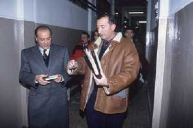 DIAP-RETROSPETTIVA SILVIO BERLUSCONI PRESIDENTE MILAN E PRESIDENTE RUGBY MEDIOLANUM NELLA FOTO SILVIO BERLUSCONI A MILANO NELL'ANNO 1991-1992 IN VISITA ALLA SQUADRA DI RUGBY CON IL GIORNALISTA DELLA GAZZETTA DELLO SPORT CARLO GOBBI AG ALDO LIVERANI SAS