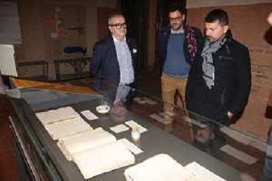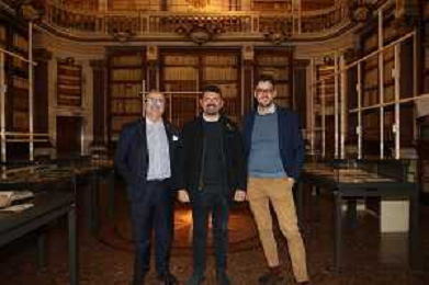 IMOLA 07 11 2025 BACCANALE 2025 l'Assessore Regionale all'Agricoltura ALESSIO MAMMI,ASSESSORE PIERANGELO RAFFINI E ASSESSORE GIACOMO GAMBI per una visita alla mostra I LIBRI-GIORNALI DELLA SPEZIERIA DI DIOTAIUTI e all'Aula Magna DELLA BIBLIOTECA COMUNALE NELLA FOTO DA SINISTRA PIERANGEL RAFFINI ALESSIO MAMMI E GIACOMO GAMBI FOTO GIANNI SANNA-AG ALDO LIVERANI SAS