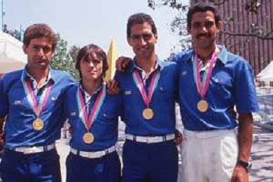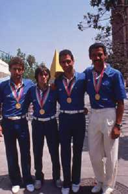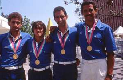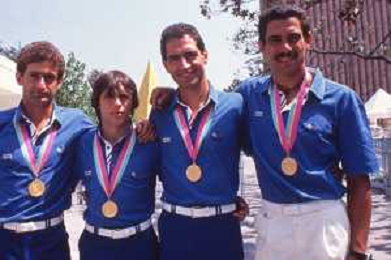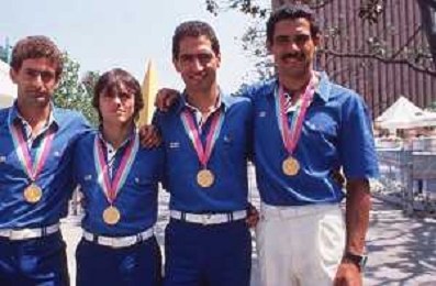 DIAP-RETROSPETTIVA VINCENZO MAENZA LOTTATORE NELLA FOTO VINCENZO MAENZA CON CRISTOFORI PIER PAOLO-MASALA DANIELE-MASSULLO CARLO ALLE OLIMPIADI DI LOS ANGELES ANNO 1984 AG ALDO LIVERANI SAS