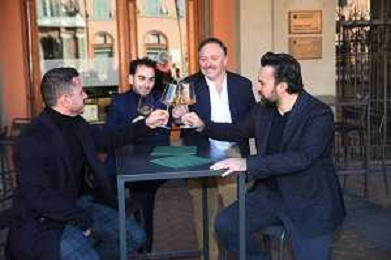 IMOLA 14 11 2025 PIAZZA MATTEOTTI CONFERENZA STAMPA un anno dopo l’apertura DEL RISTORANTE SEMPLICE NELLA FOTO DA SINISTRA FRANCESCO CIORIA,MAX MASCIA,GIACOMO MARCATTILII E DAVIDE CAMANZI ©SANNA - AGENZIA ALDO LIVERANI SAS