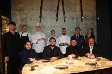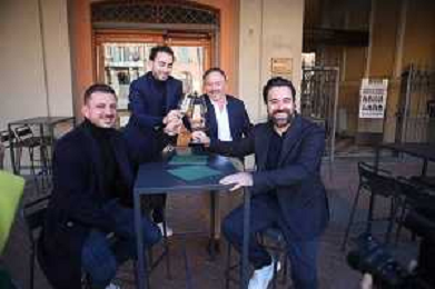 IMOLA 14 11 2025 PIAZZA MATTEOTTI CONFERENZA STAMPA un anno dopo l’apertura DEL RISTORANTE SEMPLICE NELLA FOTO DA SINISTRA FRANCESCO CIORIA,MAX MASCIA,GIACOMO MARCATTILII E DAVIDE CAMANZI CON LO STAFFI DEL RISTORANTE SEMPLICE ©SANNA - AGENZIA ALDO LIVERANI SAS