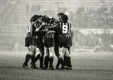 28-11-1979 MILANO QUARTI DI FINALE ANDATA DI COPPA ITALIA INTER -JUVENTUS 1-2 NELLAFOTO ABBRACCI GIOCATORI INTER DOPO IL GOAL DI GIUSEPPE PANCHERI AG ALDO LIVERANI SAS