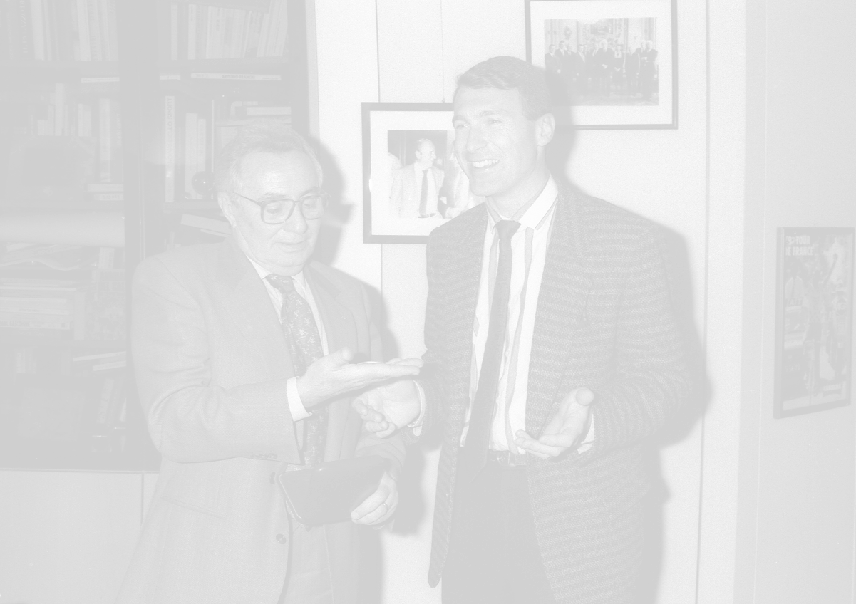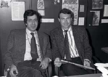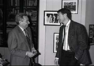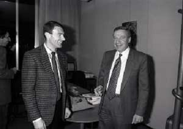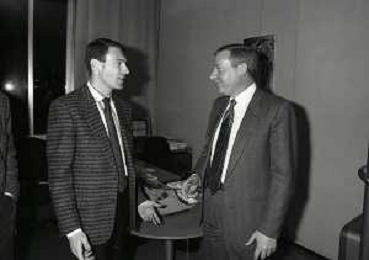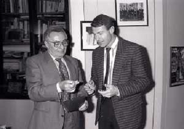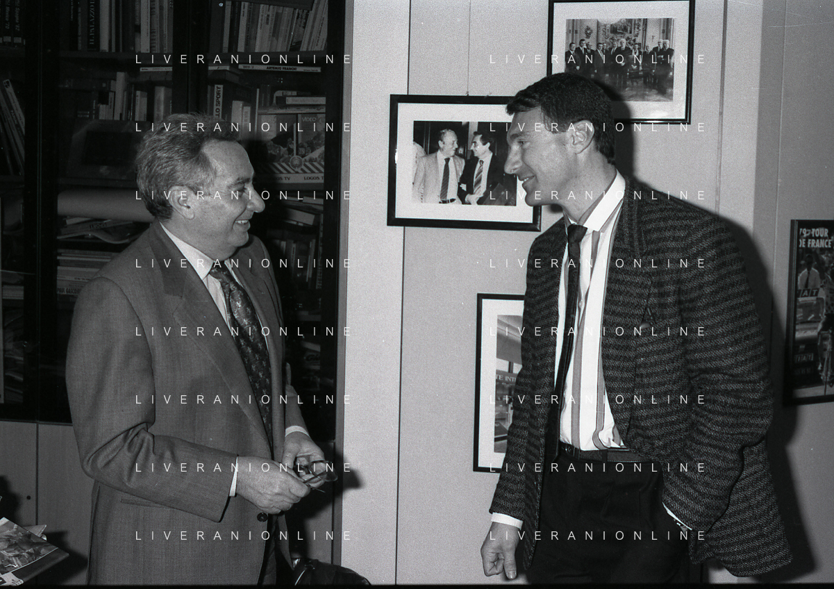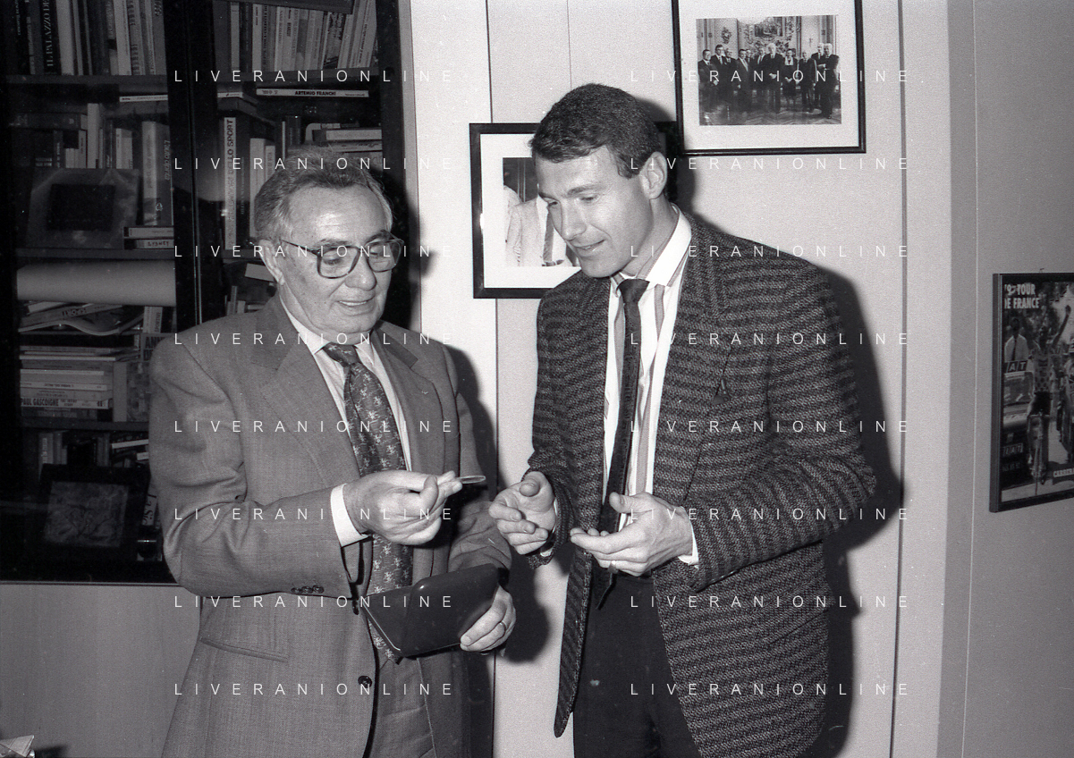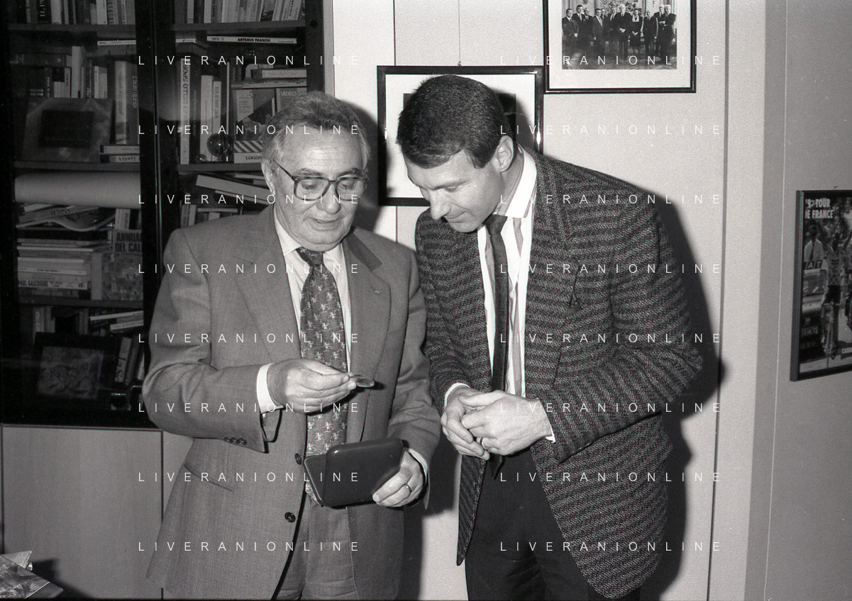 NEG-1995 MILANO- VISITA DEL PILOTA GIOVANNI LAVAGGI IN REDAZIONE ALLA GAZZETTA DELLO SPORT IN VIA SOLFERINO A MILANO NELLA FOTO GIOVANNI LAVAGGI CON IL GIORNALISTA PINO ALLIEVI AG ALDO LIVERANI SAS