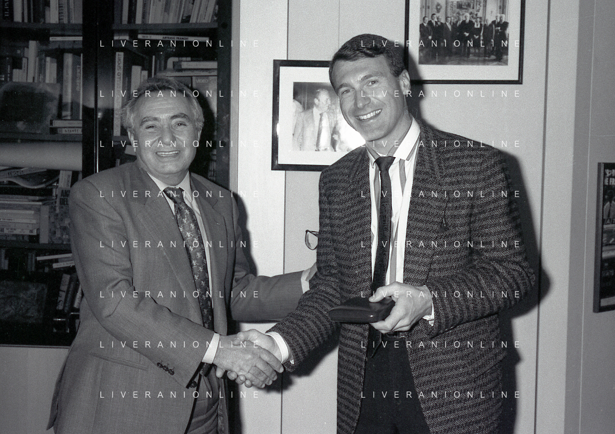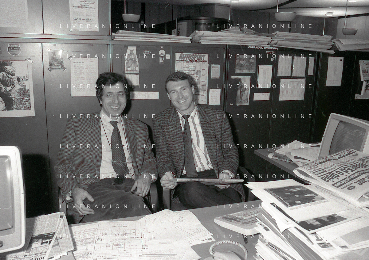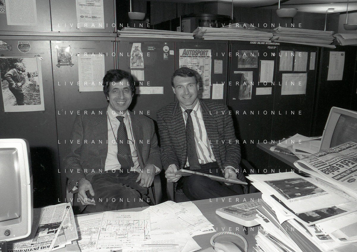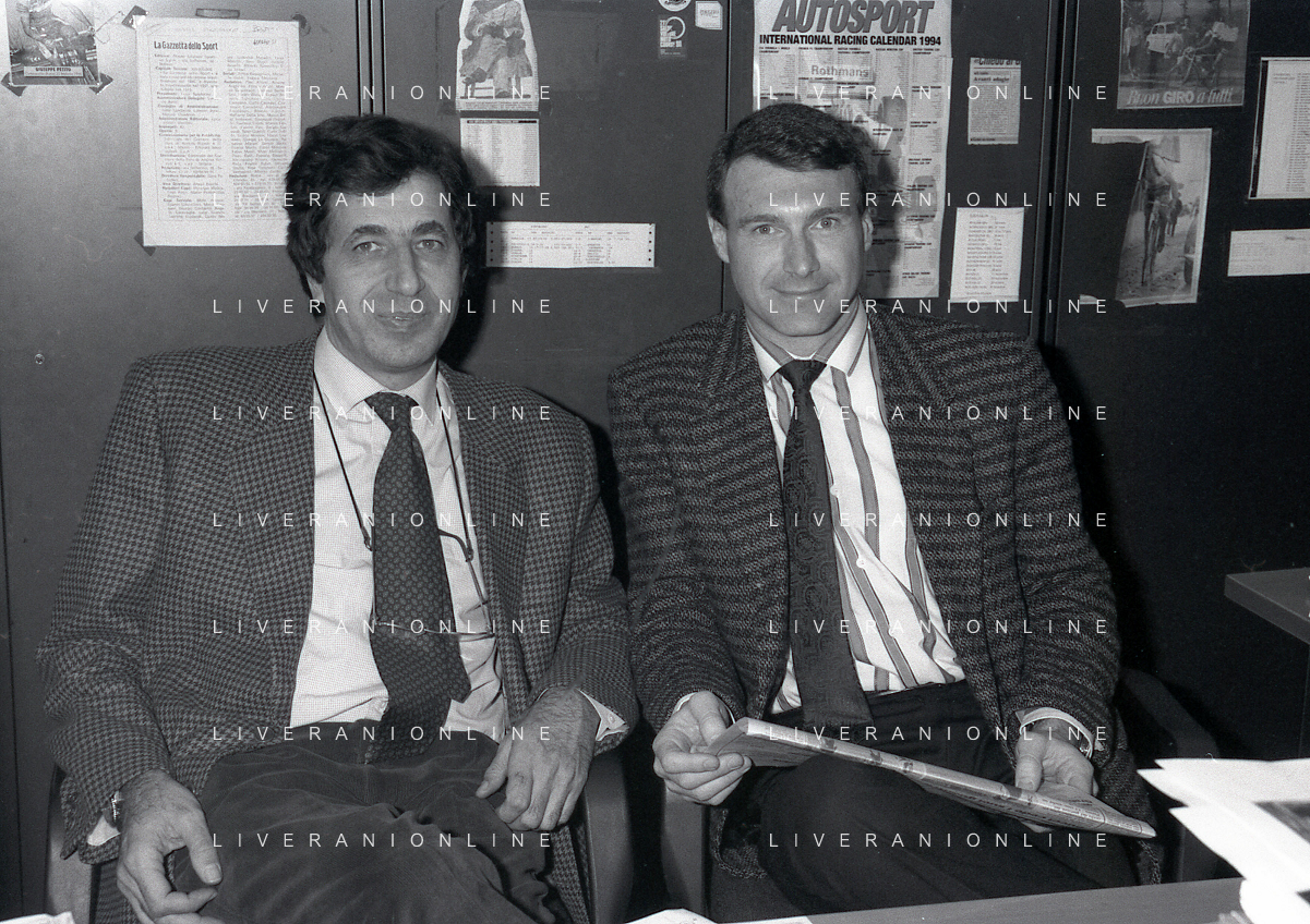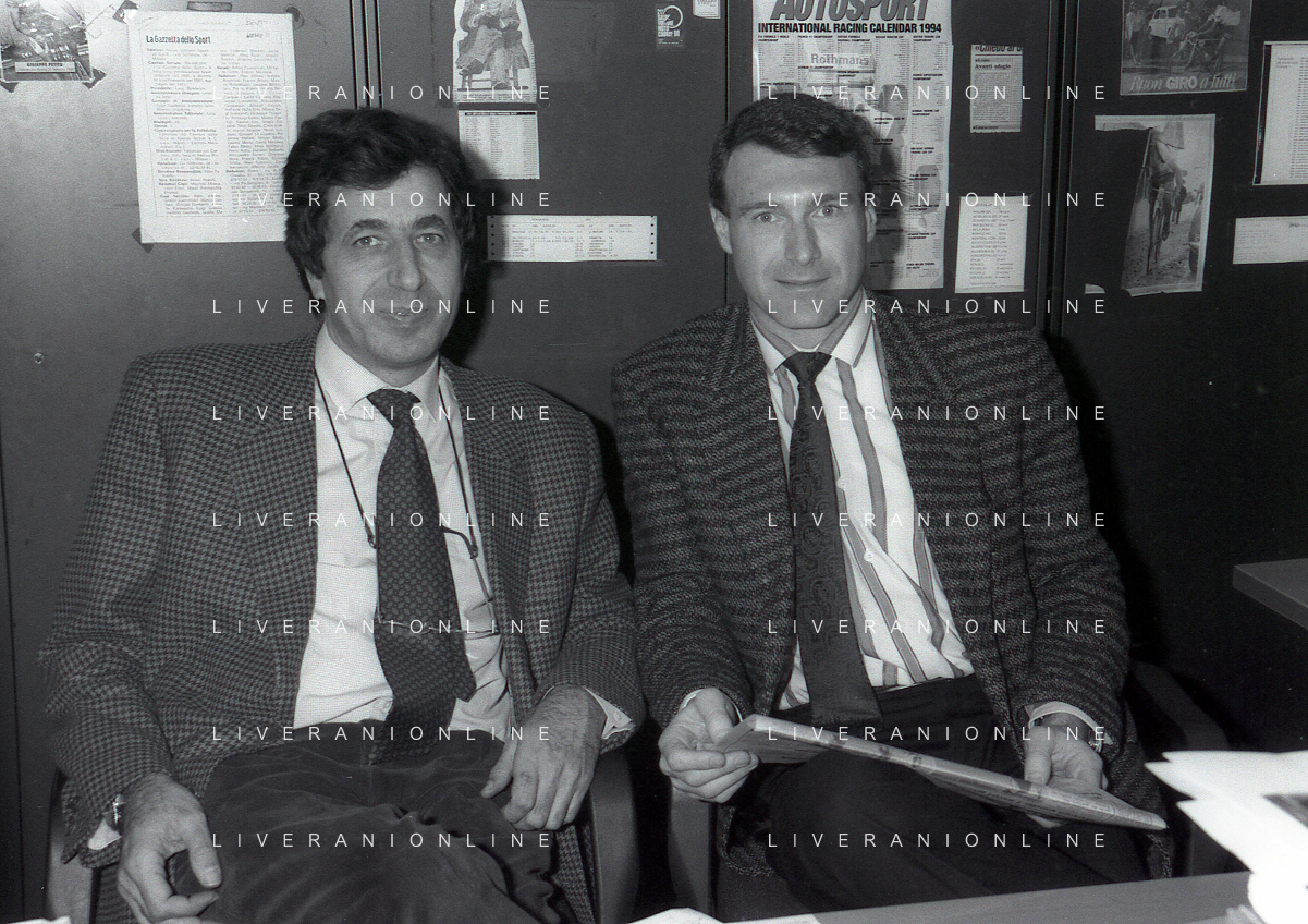 NEG-1995 MILANO- VISITA DEL PILOTA GIOVANNI LAVAGGI IN REDAZIONE ALLA GAZZETTA DELLO SPORT IN VIA SOLFERINO A MILANO NELLA FOTO IL VICE DIRETTORE DELLA GAZZETTA DELLO SPORT ROBERTO MILAZZO CON GIOVANNI LAVAGGI AG ALDO LIVERANI SAS