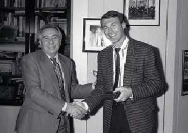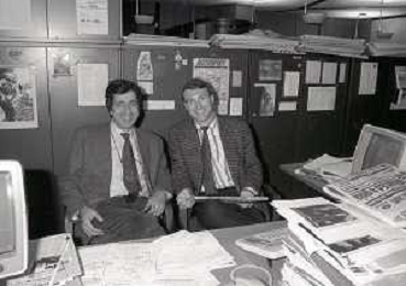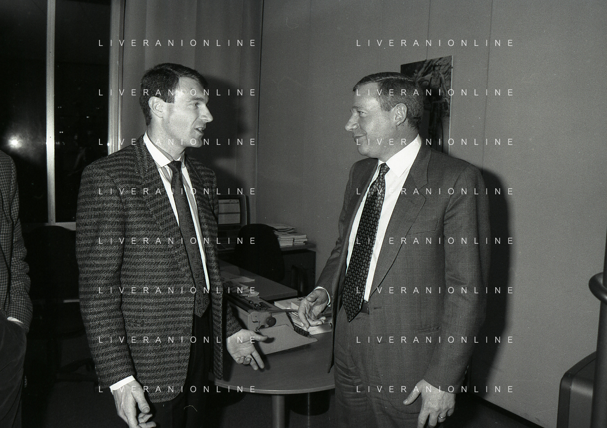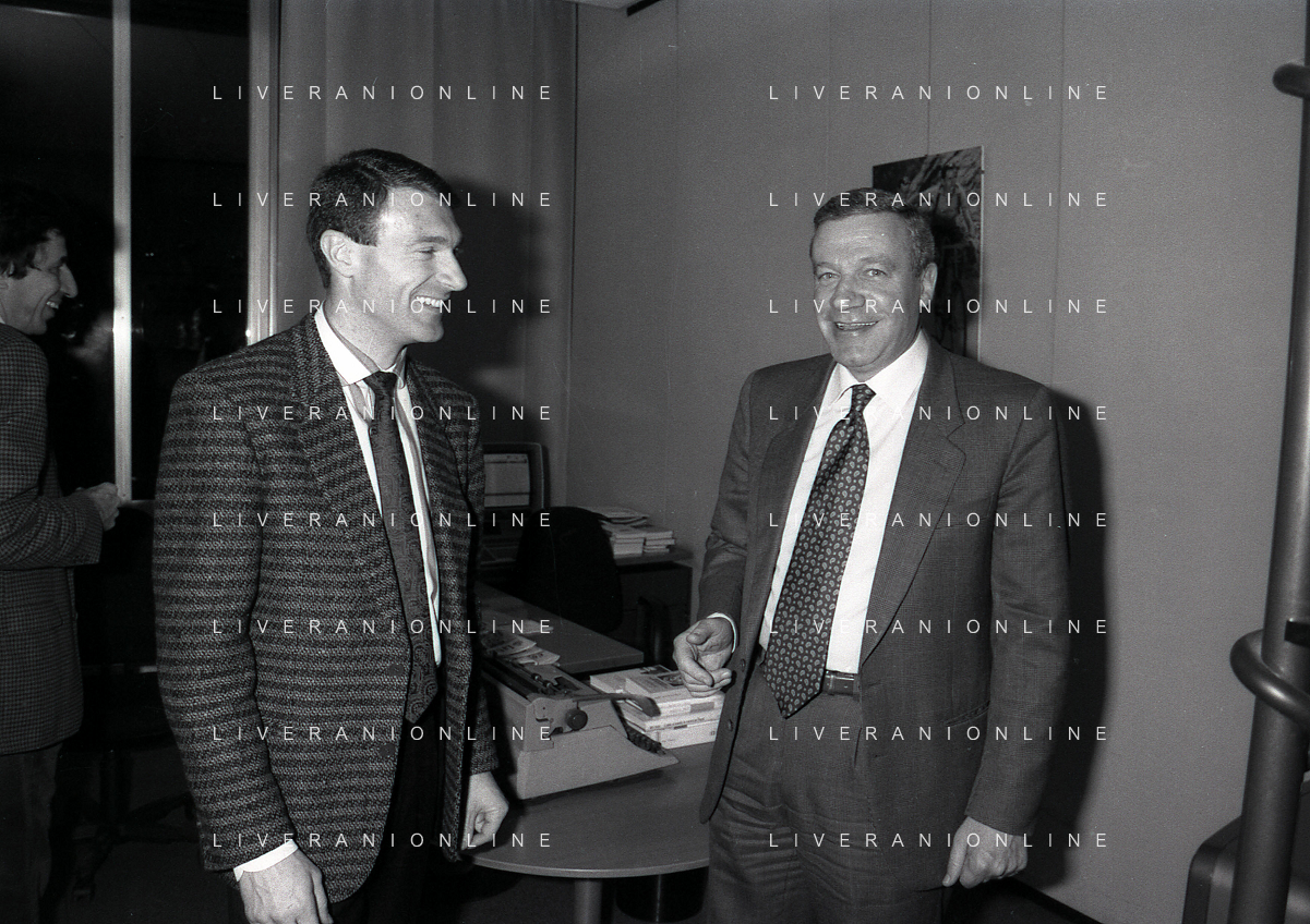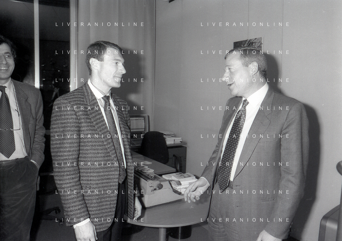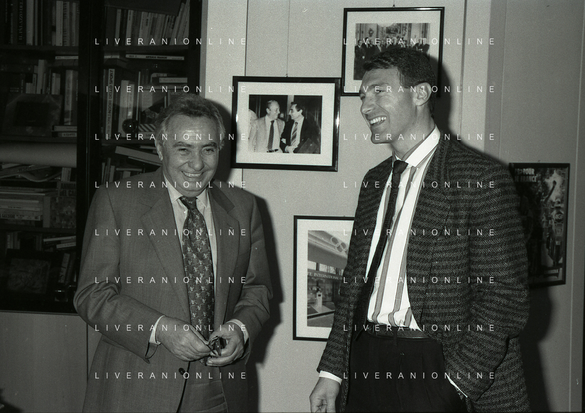 NEG-1995 MILANO- VISITA DEL PILOTA GIOVANNI LAVAGGI IN REDAZIONE ALLA GAZZETTA DELLO SPORT IN VIA SOLFERINO A MILANO NELLA FOTO IL VICE DIRETTORE DELLA GAZZETTA DELLO SPORT ROBERTO MILAZZO CON GIOVANNI LAVAGGI AG ALDO LIVERANI SAS