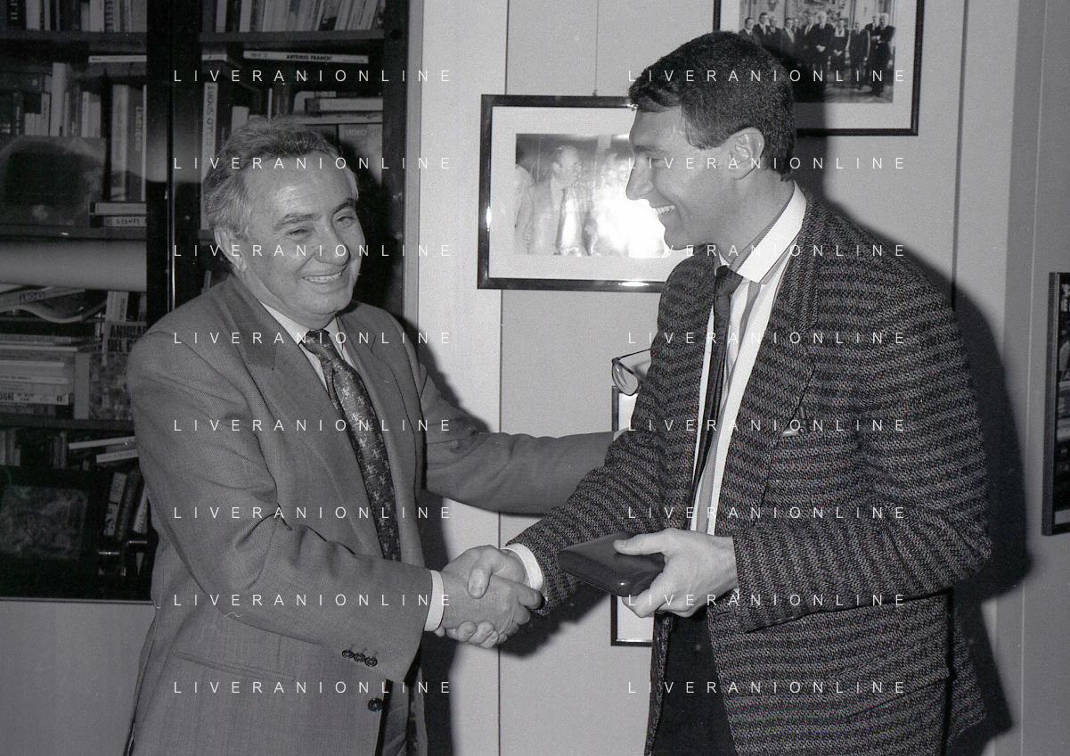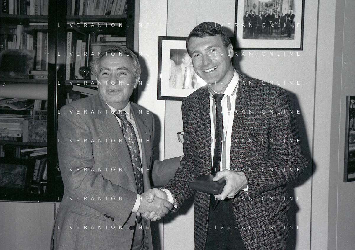 NEG-1995 MILANO- VISITA DEL PILOTA GIOVANNI LAVAGGI IN REDAZIONE ALLA GAZZETTA DELLO SPORT IN VIA SOLFERINO A MILANO NELLA FOTO IL DIRETTORE DELLA GAZZETTA DELLO SPORT CANDIDO CANNAVO' PREMIA GIOVANNI LAVAGGI AG ALDO LIVERANI SAS