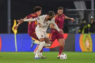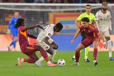 Roma vs Midtjylland Europa League - 5 Giornata Stadio Olimpico - Roma 27-11-2025 nella foto Kone e El Ayanoui chiudono Franculino Foto Federico Gaetano - ag Aldo liverani- AGENZIA ALDO LIVERANI SAS