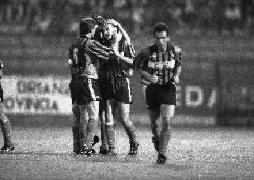 NEG-25-08-1991 MONZA- COPPA ITALIA RITORNO MONZA-PISA 0-1 NELLA FOTO ABBRACCI GIOCATORI PISA DOPO IL GOAL DI LORENZO SCARAFONI AG ALDO LIVERANI SAS