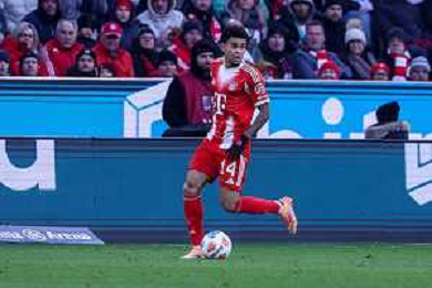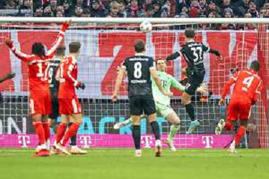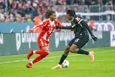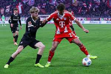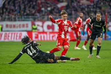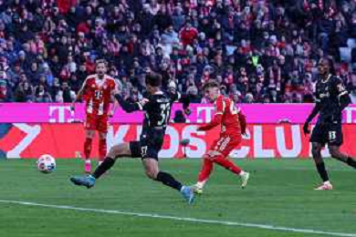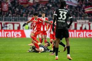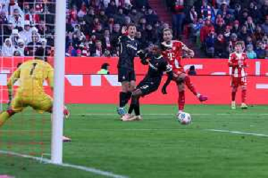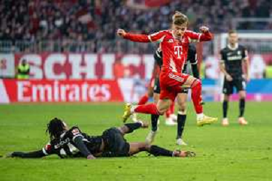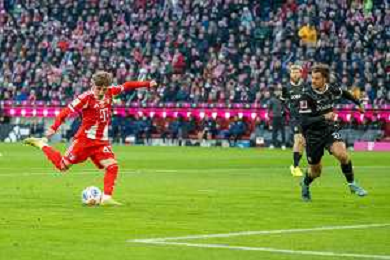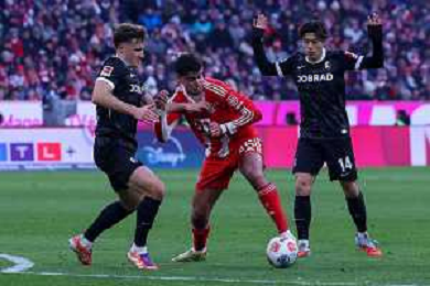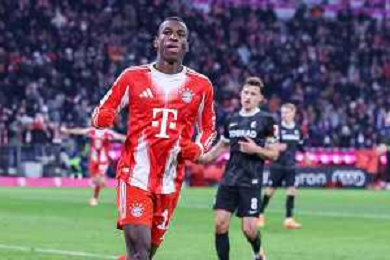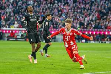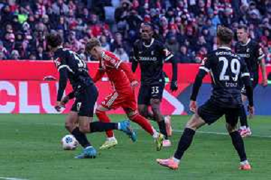 Michael Olise #17 (FC Bayern Muenchen) schaut seinem Schuss hinterher, der zum 2:2 fuehrt, FC Bayern Muenchen vs. SC Freiburg, Fussball, Bundesliga, DFL, Saison 2025/2026, Hinrunde, 22.11.2025 DFB regulations prohibit any use of photographs as image sequences and/or quasi-video / action press AG KARMAPRESS-AG ALDO LIVERANI SAS
