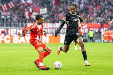 Michael Olise #17 (FC Bayern Muenchen) im Zweikampf mit Jordy Makengo #33 (SC Freiburg), FC Bayern Muenchen - SC Freiburg, Fussball, Bundesliga, 11. Spieltag, 22.11.2025 DFB regulations prohibit any use of photographs as image sequences and/or quasi-video / action press AG KARMAPRESS-AG ALDO LIVERANI SAS