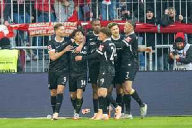 Jubel der Freiburger nach dem 0:1 durch Yuito Suzuki #14 (SC Freiburg), FC Bayern Muenchen vs. SC Freiburg, Fussball, Bundesliga, DFL, Saison 2025/2026, Hinrunde, 22.11.2025 DFB regulations prohibit any use of photographs as image sequences and/or quasi-video / action press AG KARMAPRESS-AG ALDO LIVERANI SAS