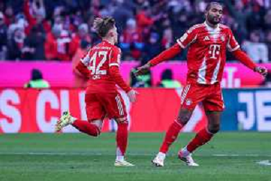 Jonathan Tah #4 (FC Bayern Muenchen) gratuliert Lennart Karl #42 (FC Bayern Muenchen) zu seinem Treffer zum 1:2, Jubel, FC Bayern Muenchen vs. SC Freiburg, Fussball, Bundesliga, DFL, Saison 2025/2026, Hinrunde, 22.11.2025 DFB regulations prohibit any use of photographs as image sequences and/or quasi-video / action press AG KARMAPRESS-AG ALDO LIVERANI SAS