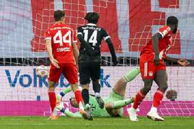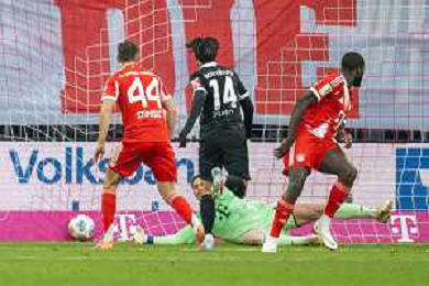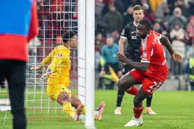 Dayot Upamecano #2 (FC Bayern Muenchen) mit dem 3:2, Jubel, Noah Atubolu #1 (SC Freiburg) ohne Chance, FC Bayern Muenchen vs. SC Freiburg, Fussball, Bundesliga, DFL, Saison 2025/2026, Hinrunde, 22.11.2025 DFB regulations prohibit any use of photographs as image sequences and/or quasi-video / action press AG KARMAPRESS-AG ALDO LIVERANI SAS