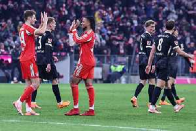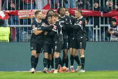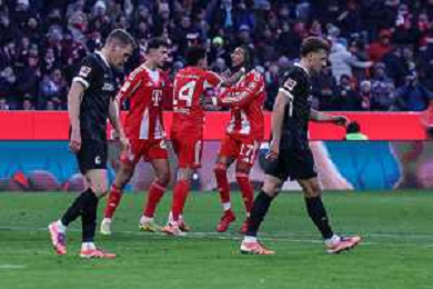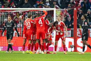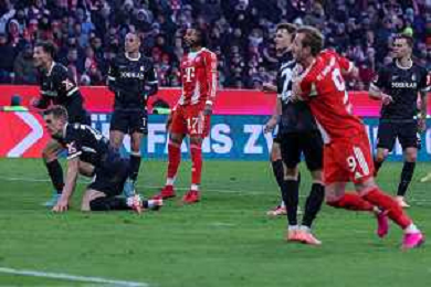 Torjubel der Mannschaft (FC Bayern Muenchen) nach dem 2:2 durch Michael Olise #17 (FC Bayern Muenchen), enttaeuschte Freiburger, FC Bayern Muenchen vs. SC Freiburg, Fussball, Bundesliga, DFL, Saison 2025/2026, Hinrunde, 22.11.2025 DFB regulations prohibit any use of photographs as image sequences and/or quasi-video / action press AG KARMAPRESS-AG ALDO LIVERANI SAS