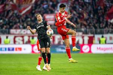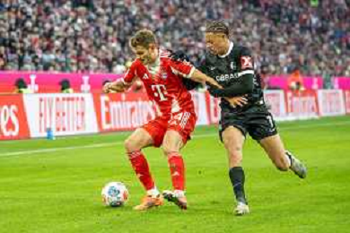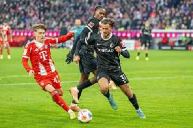 Philipp Treu #29 (SC Freiburg) vor Alexandar Pavlovic #45 (FC Bayern Muenchen) am Ball, FC Bayern Muenchen vs. SC Freiburg, Fussball, Bundesliga, DFL, Saison 2025/2026, Hinrunde, 22.11.2025 DFB regulations prohibit any use of photographs as image sequences and/or quasi-video / action press AG KARMAPRESS-AG ALDO LIVERANI SAS