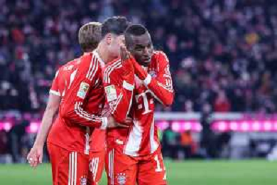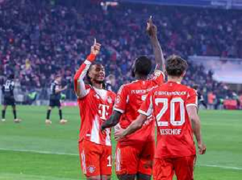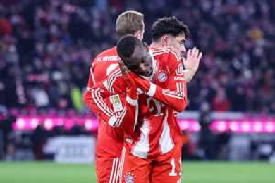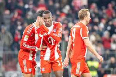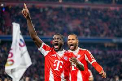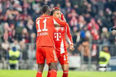 Michael Olise #17 (FC Bayern Muenchen) und Dayot Upamecano #2 (FC Bayern Muenchen) mit einem Gruss nach oben, Jubel zum 3:2, FC Bayern Muenchen vs. SC Freiburg, Fussball, Bundesliga, DFL, Saison 2025/2026, Hinrunde, 22.11.2025 DFB regulations prohibit any use of photographs as image sequences and/or quasi-video / action press AG KARMAPRESS-AG ALDO LIVERANI SAS