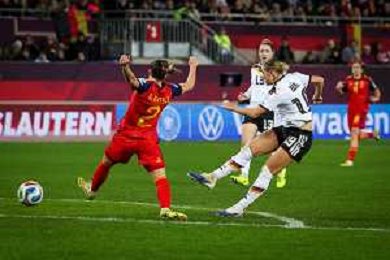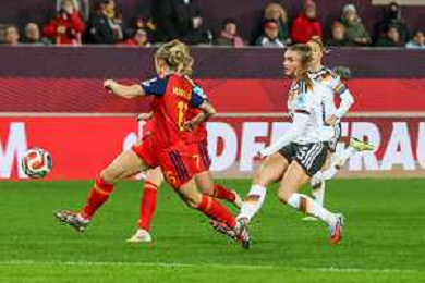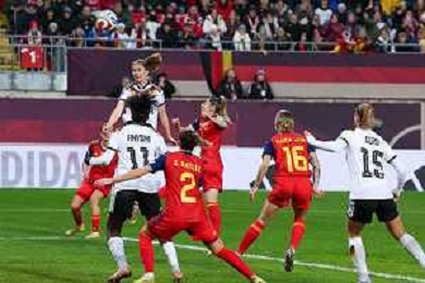 Kopfball von Sjoeke Nuesken #9 (Deutschland), der ueber das Tor geht, Deutschland vs. Spanien, Fussball, Frauen, UEFA, Women’s Nations League, Saison 2025/2026, Finale - Runde 1 von 2, 28.11.2025 / action press AG KARMAPRESS-AG ALDO LIVERANI SAS