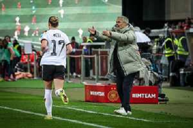 Cheftrainer Christian Wueck(Deutschland) gestikuliert, mit Franziska Kett #17 (Deutschland), Deutschland vs. Spanien, Fussball, Frauen, UEFA, Women’s Nations League, Saison 2025/2026, Finale - Runde 1 von 2, 28.11.2025 / action press AG KARMAPRESS-AG ALDO LIVERANI SAS