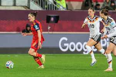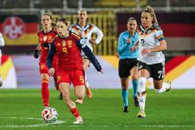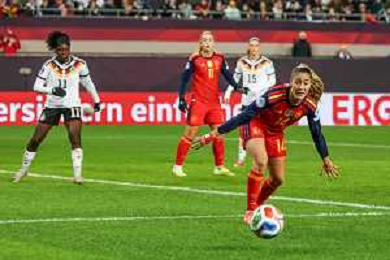 Esther Gonzalez # (Spanien / Seleccion Espanola Femenina de Futbol) in Aktion gegen Giulia Gwinn #7 (Deutschland), Deutschland vs. Spanien, Fussball, Frauen, UEFA, Women’s Nations League, Saison 2025/2026, Finale - Runde 1 von 2, 28.11.2025 / action press AG KARMAPRESS-AG ALDO LIVERANI SAS
