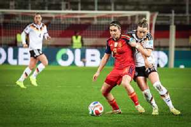 Eunate Astralaga # (Spanien / Seleccion Espanola Femenina de Futbol) in Aktion gegen Selina Cerci #15 (Deutschland), Deutschland vs. Spanien, Fussball, Frauen, UEFA, Women’s Nations League, Saison 2025/2026, Finale - Runde 1 von 2, 28.11.2025 / action press AG KARMAPRESS-AG ALDO LIVERANI SAS