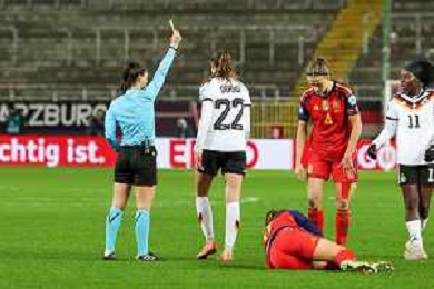 Gelbe Karte von Referee / Schiedsrichter Iuliana Demetrescu (Rumaenien) fuer Jule Brand #22 (Deutschland), Deutschland vs. Spanien, Fussball, Frauen, UEFA, Women’s Nations League, Saison 2025/2026, Finale - Runde 1 von 2, 28.11.2025 / action press AG KARMAPRESS-AG ALDO LIVERANI SAS