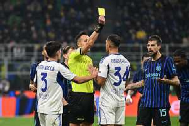 Inter vs Como nella foto l'arbitro Marco Di Bello di Brindisi ammonisce Diego Carlos Santos Silva (Como) Milano 06-12-2025 Stadio Giuseppe Meazza - San Siro Inter vs Como Campionato Serie A Enilive - 14a giornata foto Roberto Garavaglia/Agenzia Aldo Liverani sas