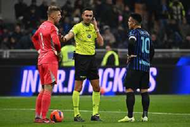 Inter vs Como nella foto l'arbitro Marco Di Bello di Brindisi annulla il gol di Federico Dimarco (Inter) per fuorigioco Milano 06-12-2025 Stadio Giuseppe Meazza - San Siro Inter vs Como Campionato Serie A Enilive - 14a giornata foto Roberto Garavaglia/Agenzia Aldo Liverani sas