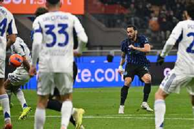 Inter vs Como nella foto Hakan Calhanoglu (Inter) segna il gol del 3 a 0 Milano 06-12-2025 Stadio Giuseppe Meazza - San Siro Inter vs Como Campionato Serie A Enilive - 14a giornata foto Roberto Garavaglia/Agenzia Aldo Liverani sas