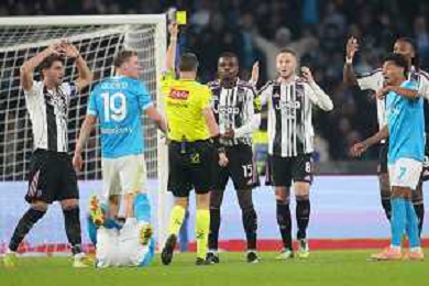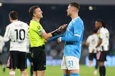 TVPM Napoli, Juventus Nella Foto: La Penna ammonisce Pierre Kalulu Foto Mosca, Ag.Liverani -TVPM Napoli - Juventus Campionato Calcio Serie A 07.12.2025