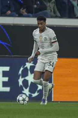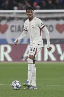 Joshua Acheampong of Chelsea FC play the ball during Atalanta BC vs Chelsea FC, Champions League 2025-26 League phase, Matchday 6°, game at New Balance Arena in Bergamo (BG), Italy, on Dicember 09, 2025. (Photo by Davide Casentini)- AGENZIA ALDO LIVERANI SAS