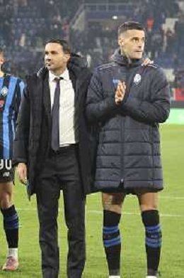 Raffaele Palladino Head Coach of Atalanta BC and Gianluca Scamacca of Atalanta BC. applaud the fans following the final whistle during Atalanta BC vs Chelsea FC, Champions League 2025-26 League phase, Matchday 6°, game at New Balance Arena in Bergamo (BG), Italy, on Dicember 09, 2025. (Photo by Davide Casentini)- AGENZIA ALDO LIVERANI SAS