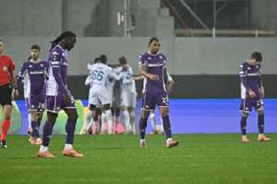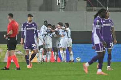 TVRG Fiorentina vs Dinamo Kiev nella foto delusione Fiorentina dopo il gol subito e giocatori Dinamo Kiev esultanza dopo il gol dell'1 a 1 Firenze 11-12-2025 Stadio Artemio Franchi Fiorentina vs Dinamo Kiev UEFA Conference League fase a girone unico - 5a giornata foto Roberto Garavaglia/Agenzia Aldo Liverani sas