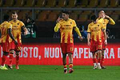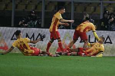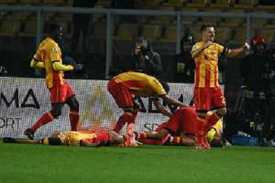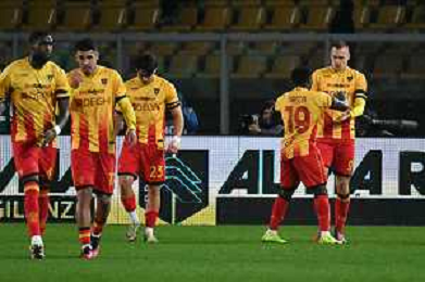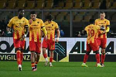 TVEM December 12, 2025 Lecce, Italy - US Lecce vs Pisa - Italian soccer serie A 2025/26 - Via Del Mare Stadium. In the pic: Nikola Stulic of US Lecce celebrates after scoring a goal with teammates ©TVEM Emmanuele Mastrodonato - AGENZIA ALDO LIVERANI SAS