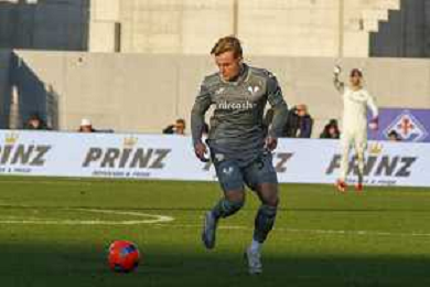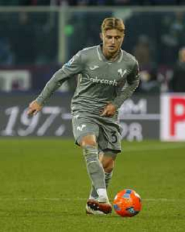 Martin Frese of Hellas Verona FC play the ball during ACF Fiorentina vs Hellas Verona FC, 15° Serie A Enilive 2025-26 game at Artemio Franchi stadium in Firenze (FI), Italy, on Dicember 14, 2025. (Photo by Davide Casentini) AG ALDO LIVERANI SAS